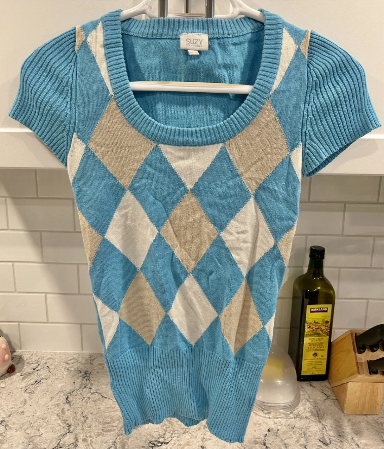 Women’s Argyle Sweater (Suzy Shier) Excellent condition Back is plain blue Women’s size XS Just wrinkly from being in drawer See other listings for more women’s clothing