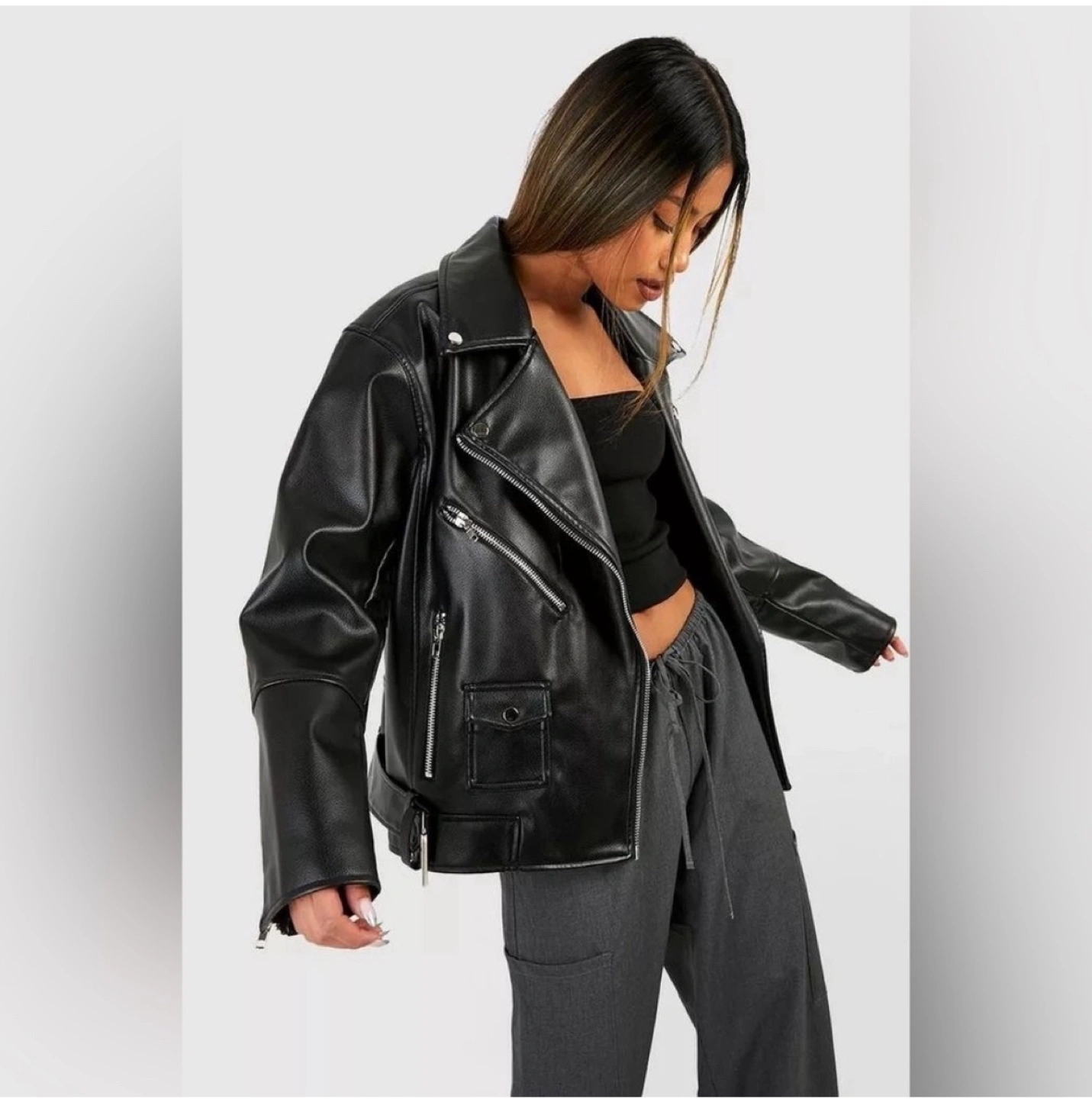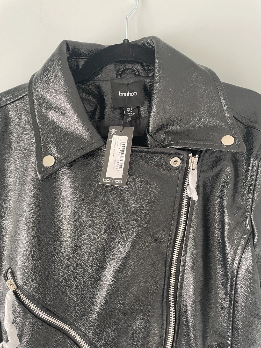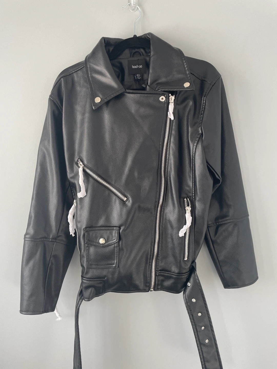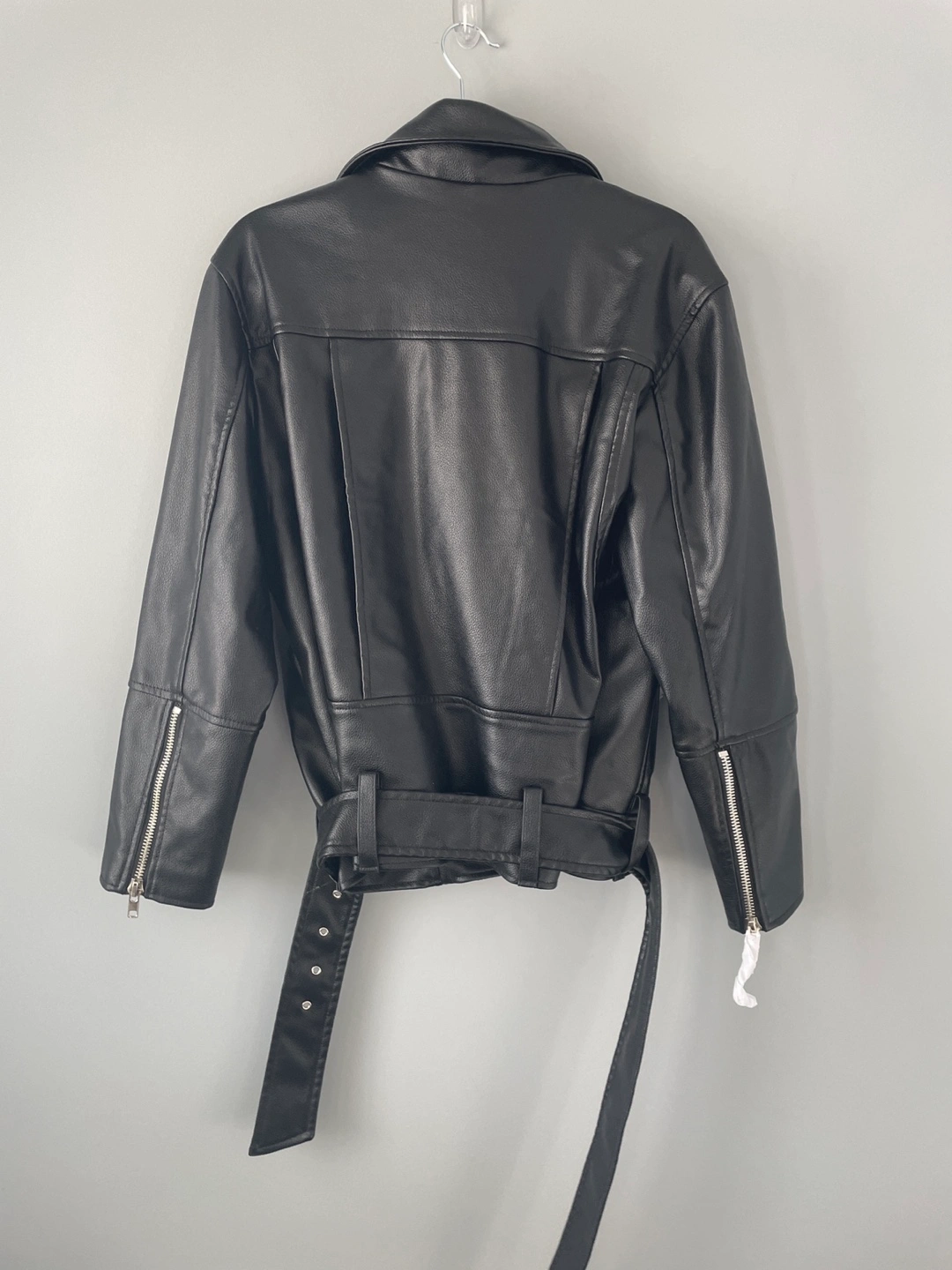 Black faux leather jacket with a belted waist and a zipper closure. Has multiple pockets. New with tags.