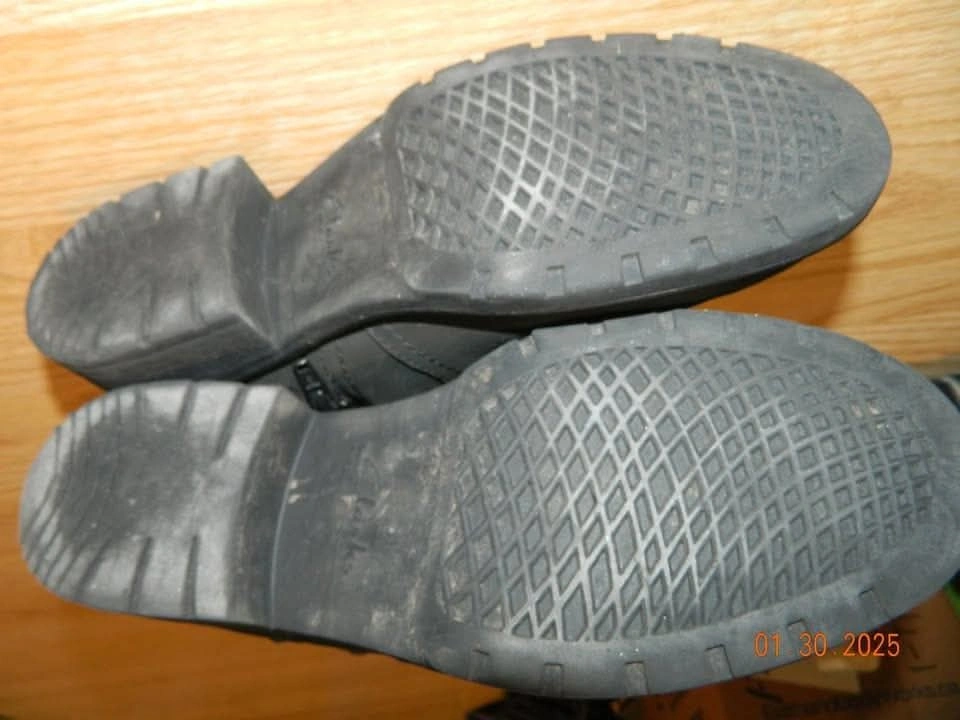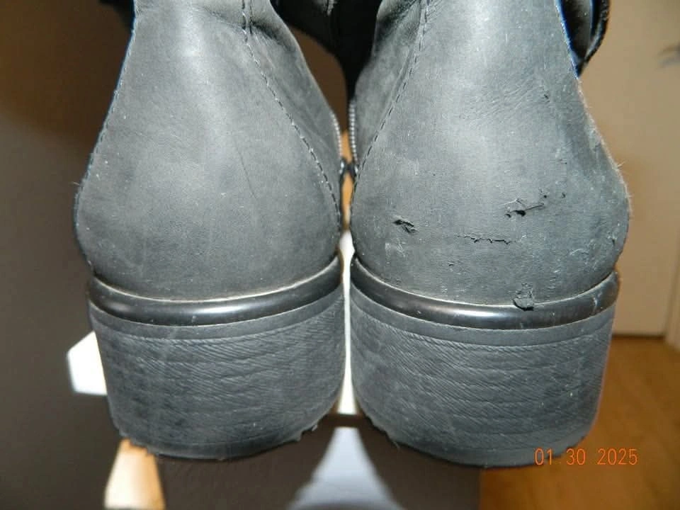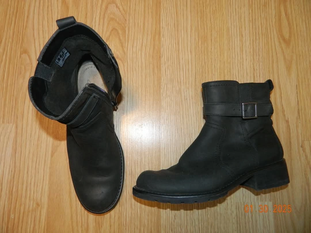 Pair of women's black leather ankle boots. Low block heel. Buckle detail. Some wear and tear visible. WOMENS CLARKS BOOTS...size 7...LIKE NEW other than a scuff on back of one heel