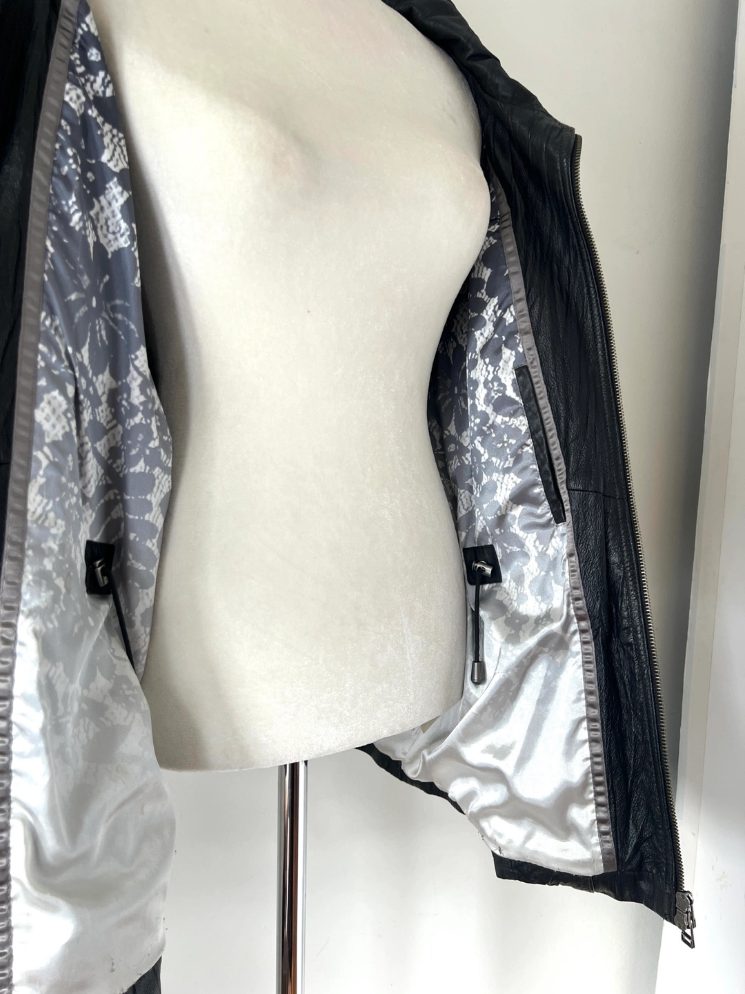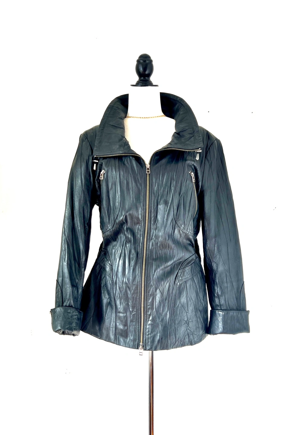 GORGEOUS classic Danier Black leather jacket. Elevated biker style inspired. Zipper closure. Drawstring at waist can be worn cinched in to highlight waste or kept loose for a relaxed fit. Sleeves with zippered cuffs can be worn turned up or full length. Relaxed fit. Textured leather. Collared neckline. Beautiful silky interior lining. Perfect condition. Price is firm.