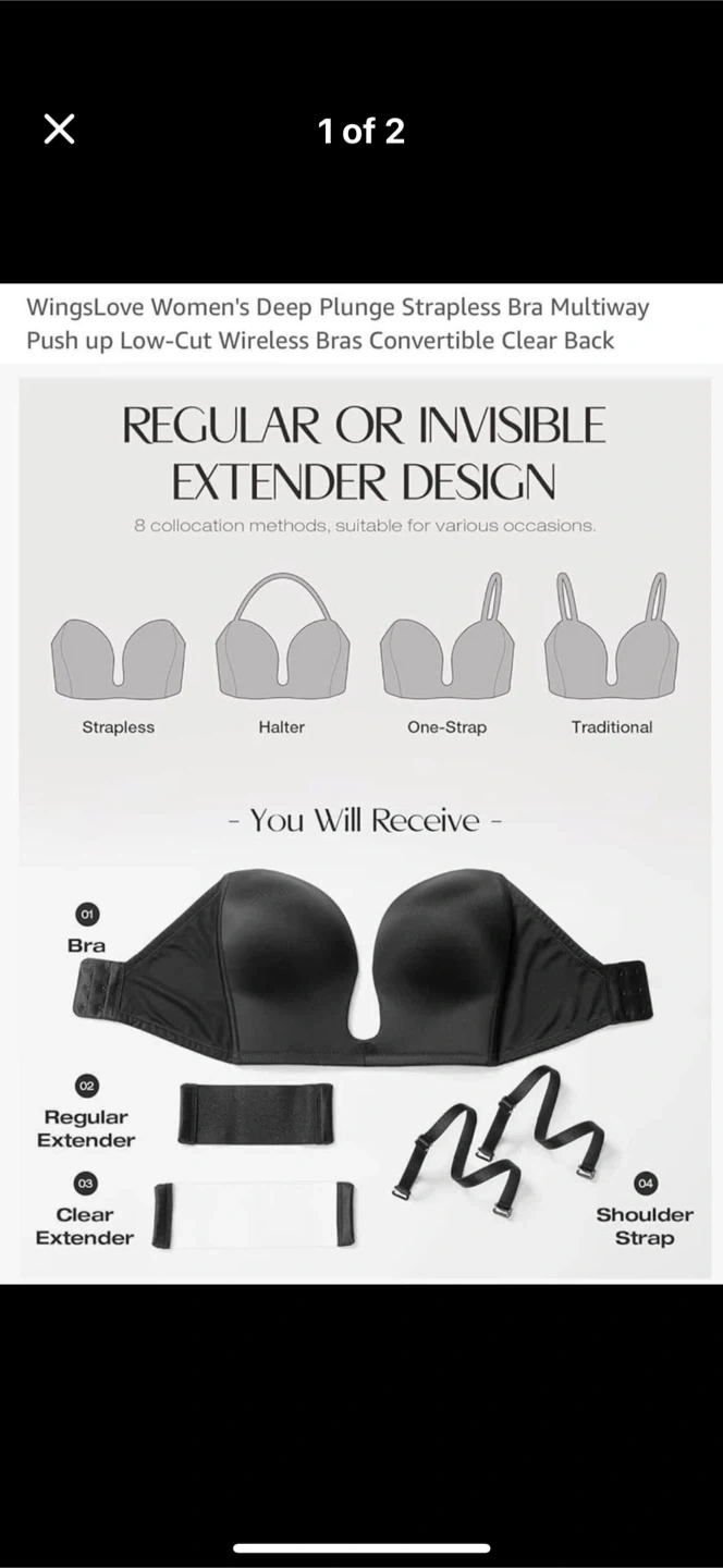 Selling a WingsLove women's deep plunge strapless bra 38C. It's a multiway push-up, low-cut, wireless bra with a convertible clear back. It features a regular or invisible extender design with 8 collocation methods. You will receive the bra, a regular extender, a clear extender, and a shoulder strap