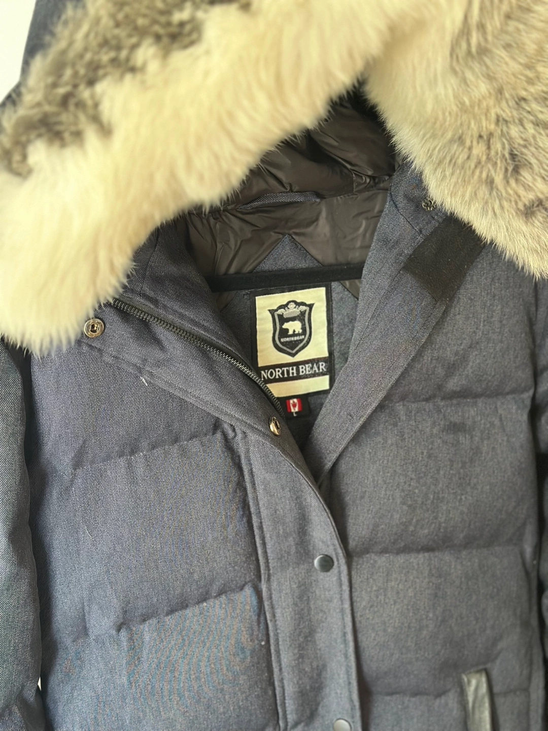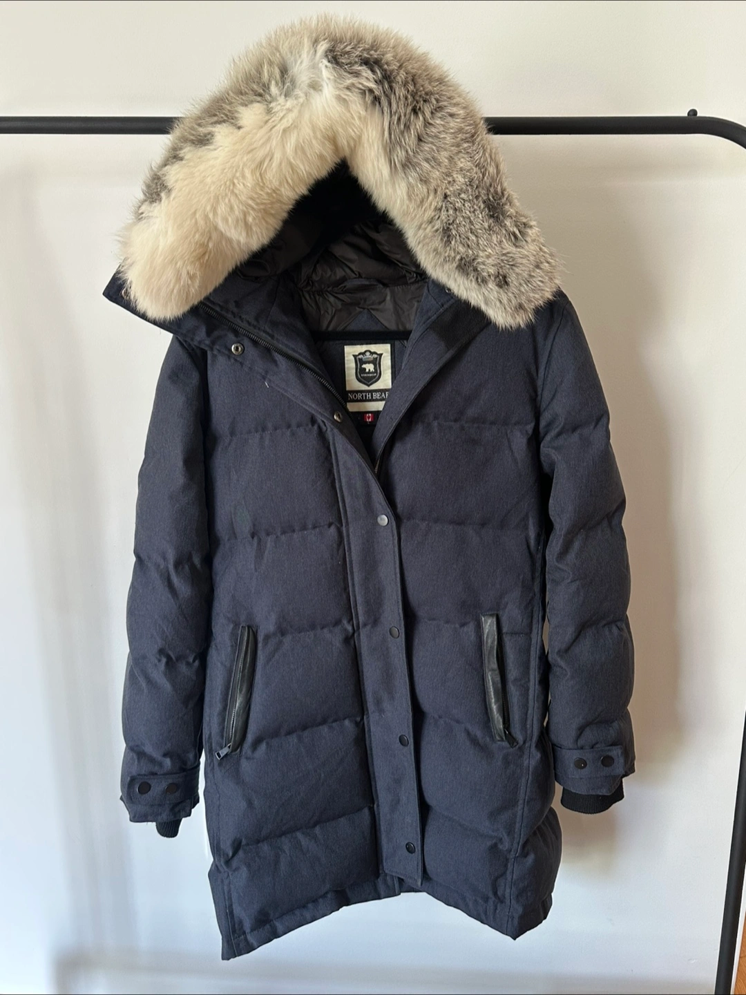 Bought at $500 Stay warm in style this winter with this North Bear women’s parka, size Large. Designed with a thick down fill, genuine fur-trimmed hood, and leather-trimmed zipper pockets, this coat combines warmth, durability, and a sleek look. • Color: Dark navy/black • Size: Women’s Large • Features: • Genuine fur hood trim • Down-filled for maximum warmth • Leather-trimmed zipper pockets • Adjustable cuffs • Heavy-duty YKK zipper (currently broken) • Condition: Good overall, except for the broken front zipper – will need repair or replacement. Perfect for someone handy with repairs or looking for a high-quality winter coat at a great price.