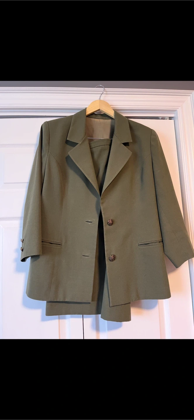 Here's a stylish vintage skirt suit set for women. It's a lovely green colour and includes both the skirt and matching blazer. Perfect for a classic and sophisticated look!