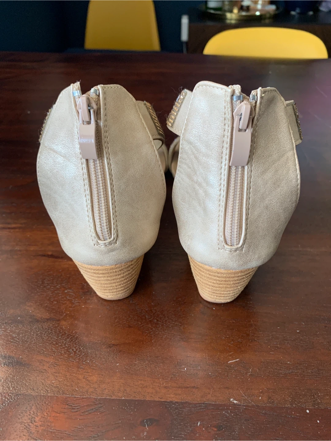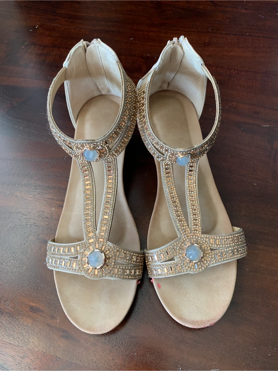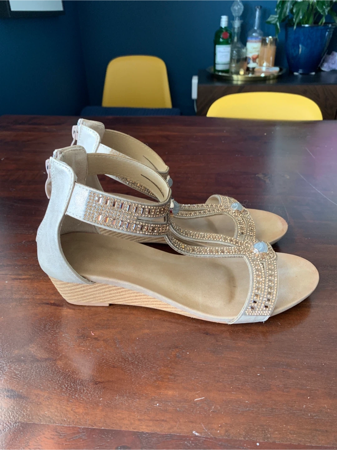 Women’s wedge sandals in a neutral/gold tone. They feature a zipper closure at the back and are embellished with rhinestones and small decorative stones. In good condition. size 9. Must pick up. Cash only.