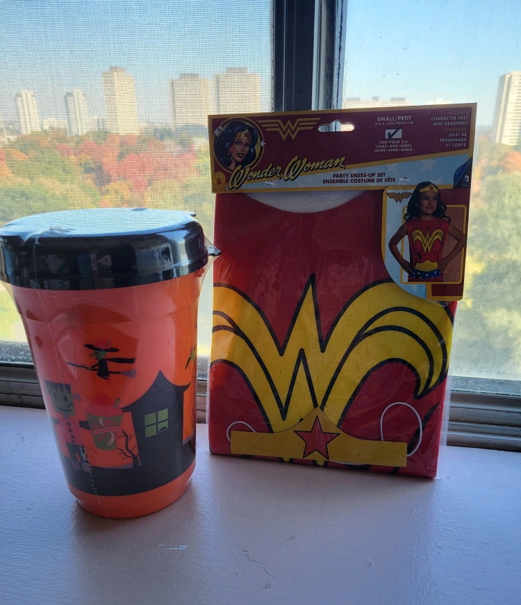I'm selling a brand new Wonder Woman Halloween Set! It's size Small 3-4 yrs, and includes a character vest and headpiece. Perfect for Halloween or dress-up fun. Included bonus collectible 32 oz Halloween mug, with handle inside. Mug can be used for trick or treating, hold snacks or drinks or even small toys!!! All Sales Final. No returns. Cash only please. Thanks!
