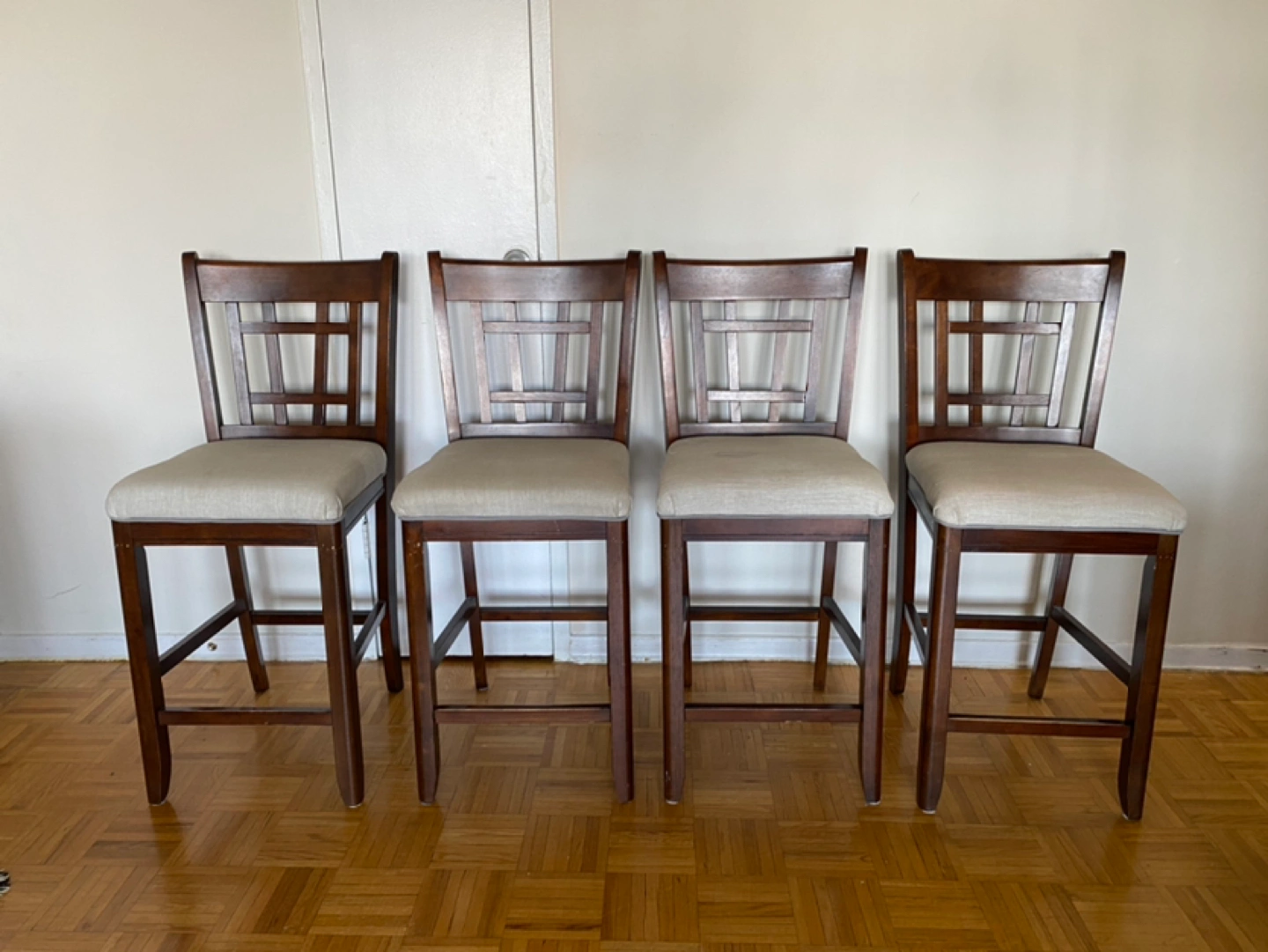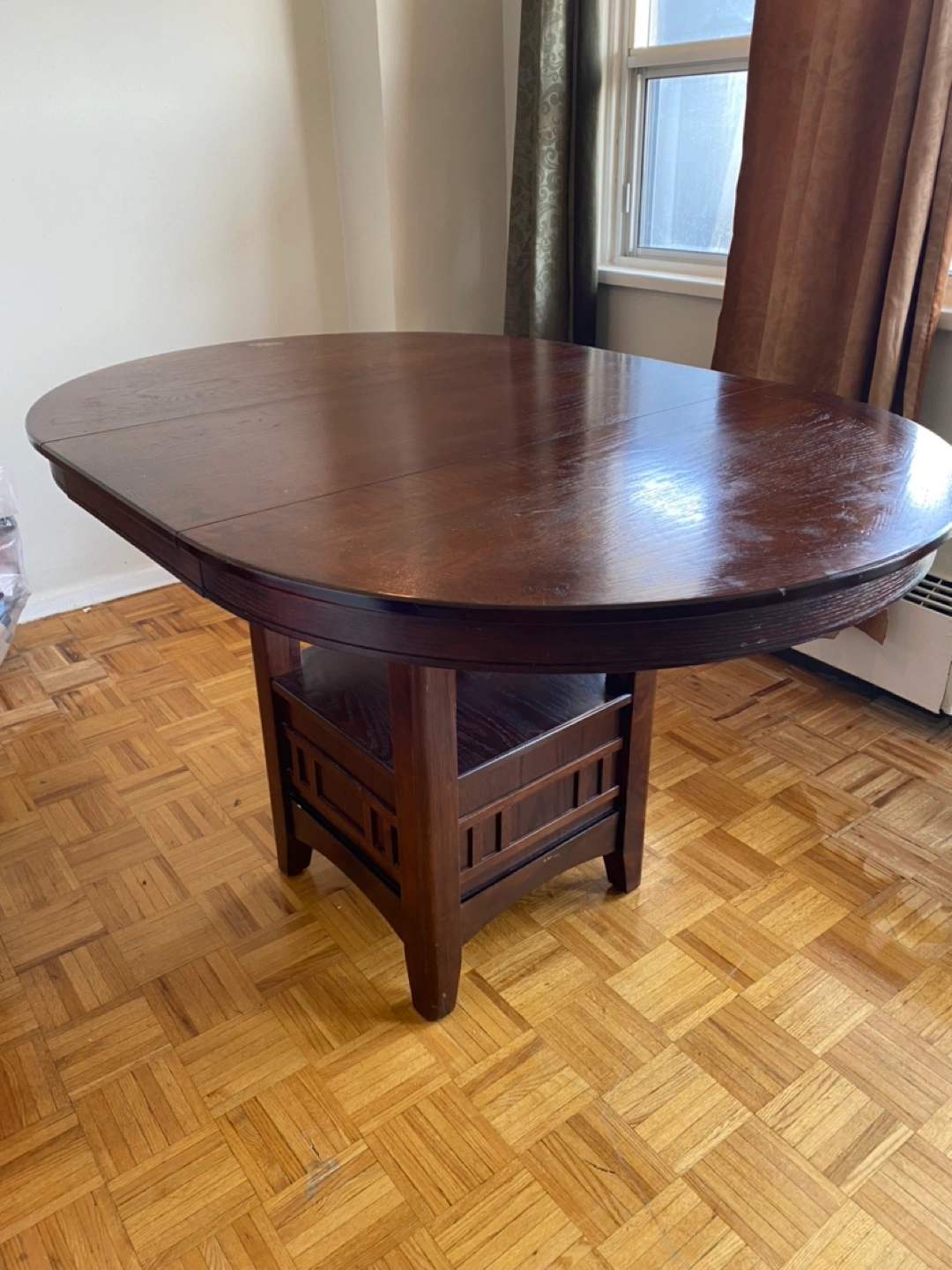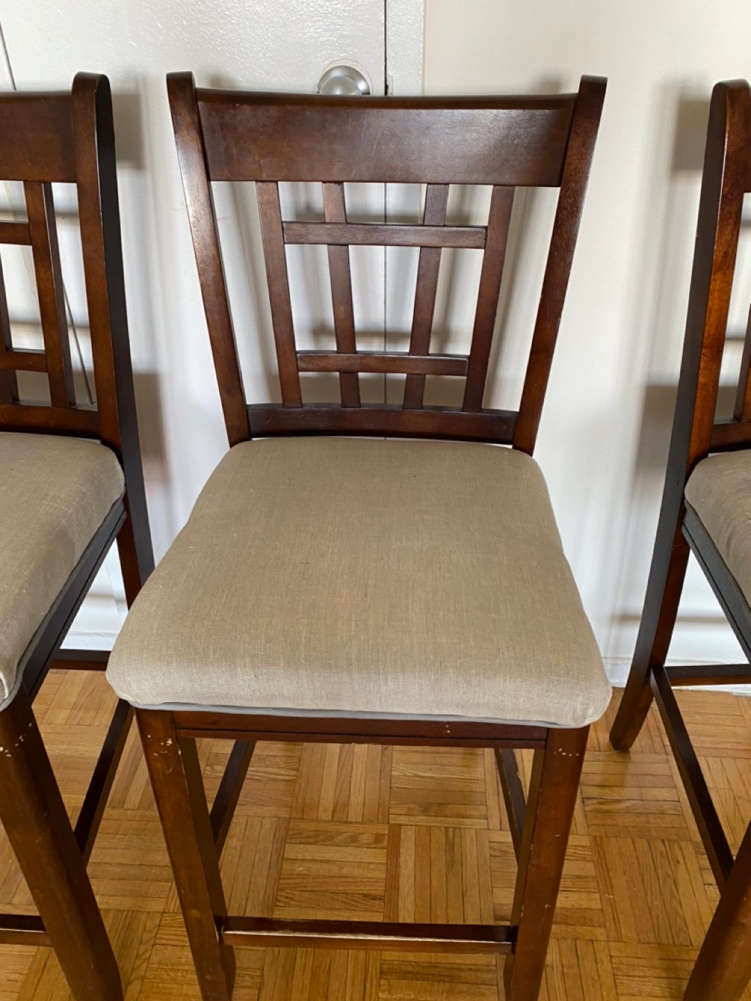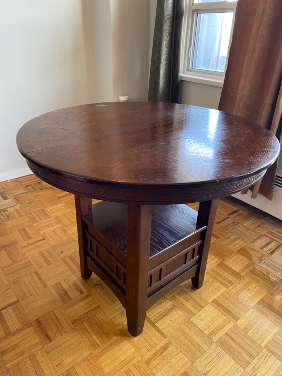 Counter height, extendable wooden dining table and four chairs $200 total. Table is 36” high, 42” diameter when small, extends to 60” with leaf inserted. Chairs are beige fabric. Some wear but in good condition.