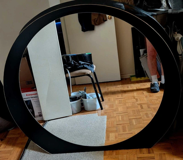 Elevate your space with this sleek, black round mirror, perfect for adding a touch of modern elegance to any room. This used mirror is in good condition and ready to reflect your stylish taste. It's a fantastic focal point for your Dresser or anywhere you need. Measurements: Overall, 43" Wide and 39" Tall. Mirror is 35" Round. $40/obo. Pick up in East York only. If you're seeing this ad, then yes, it's still available!