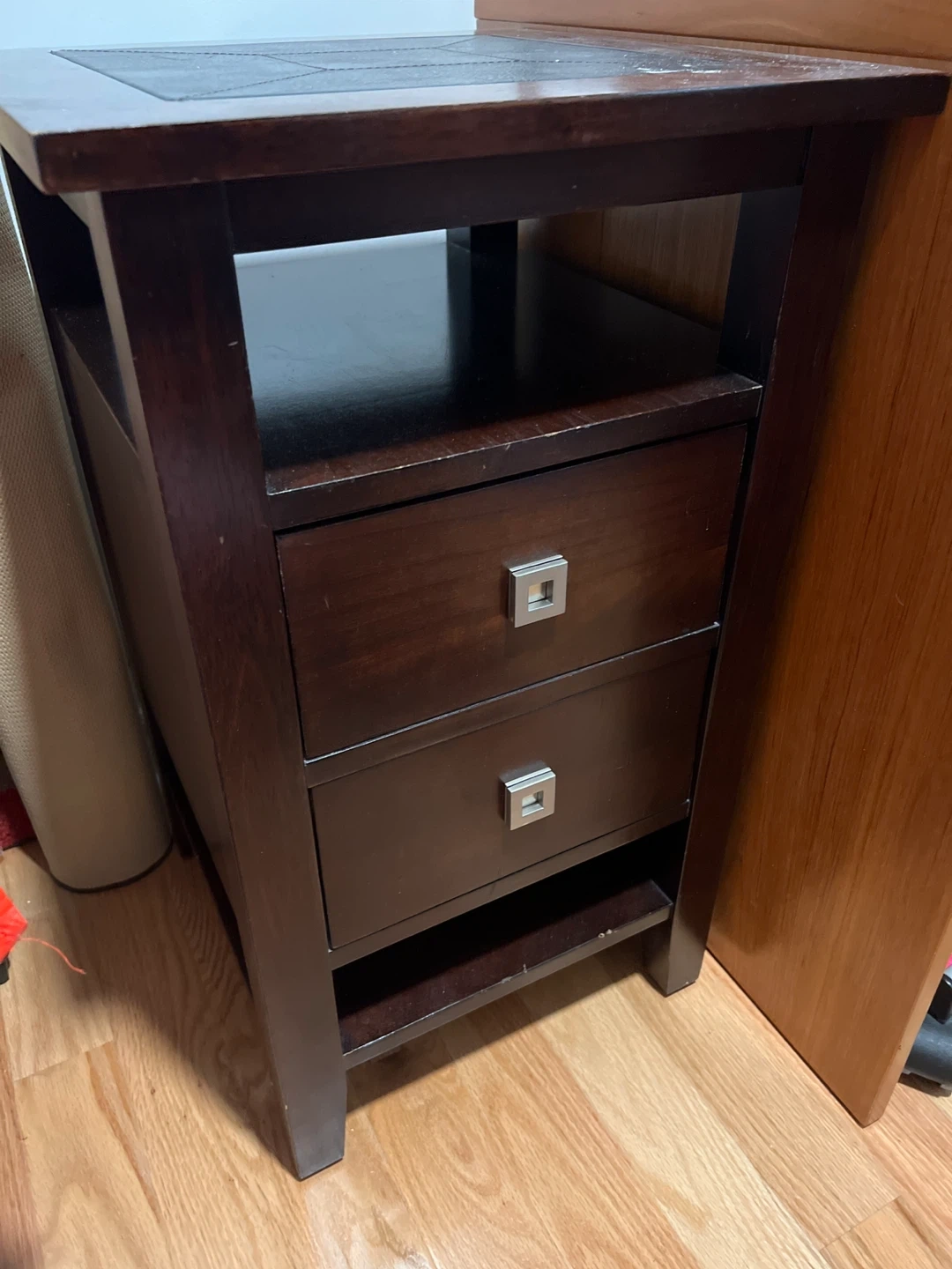 A lovely wood nightstand with two drawers and a shelf, perfect for your bedside needs! The top has a nice black leather-like surface. It's in great condition and ready for a new home