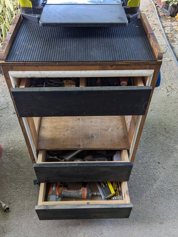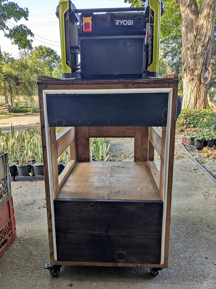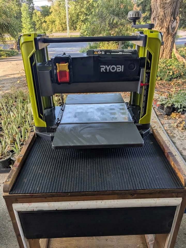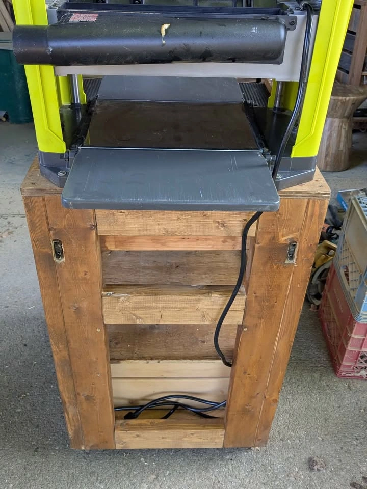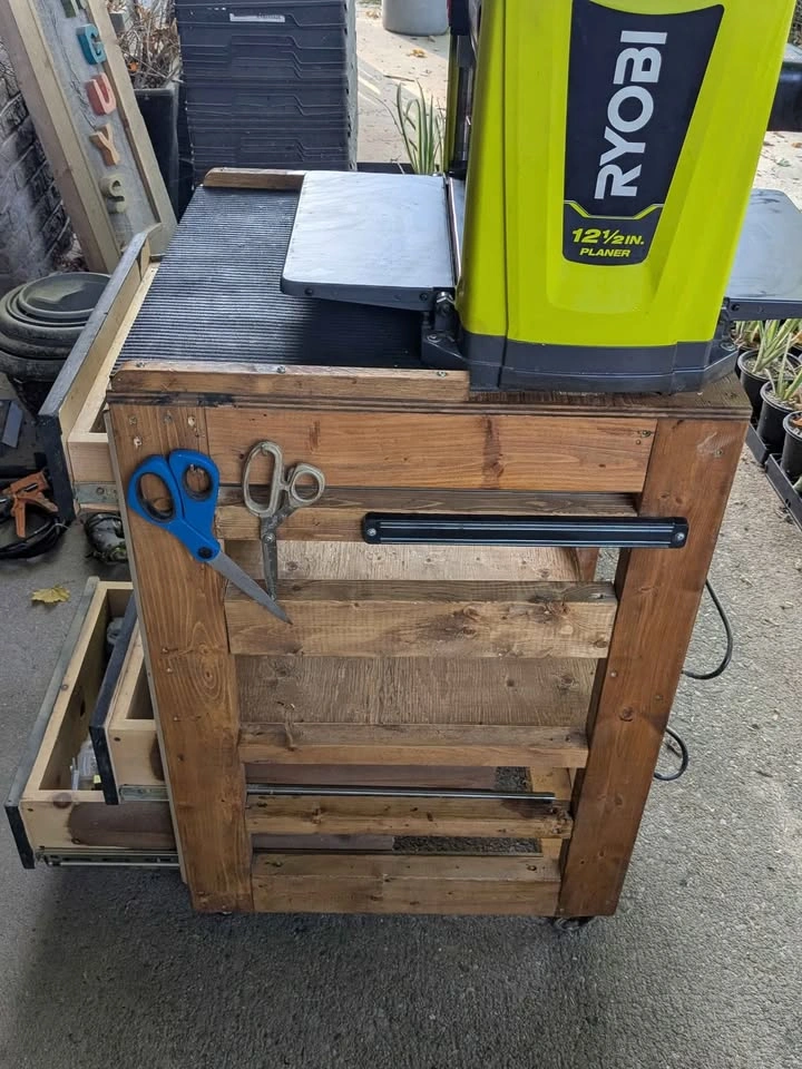 Wood planer on rolling shop cart with lots of storage. Custom designed and hand built. On locking caster wheels. Planer in great shape, planes smooth no Knicks in blade. Very sturdy build. Well maintained.