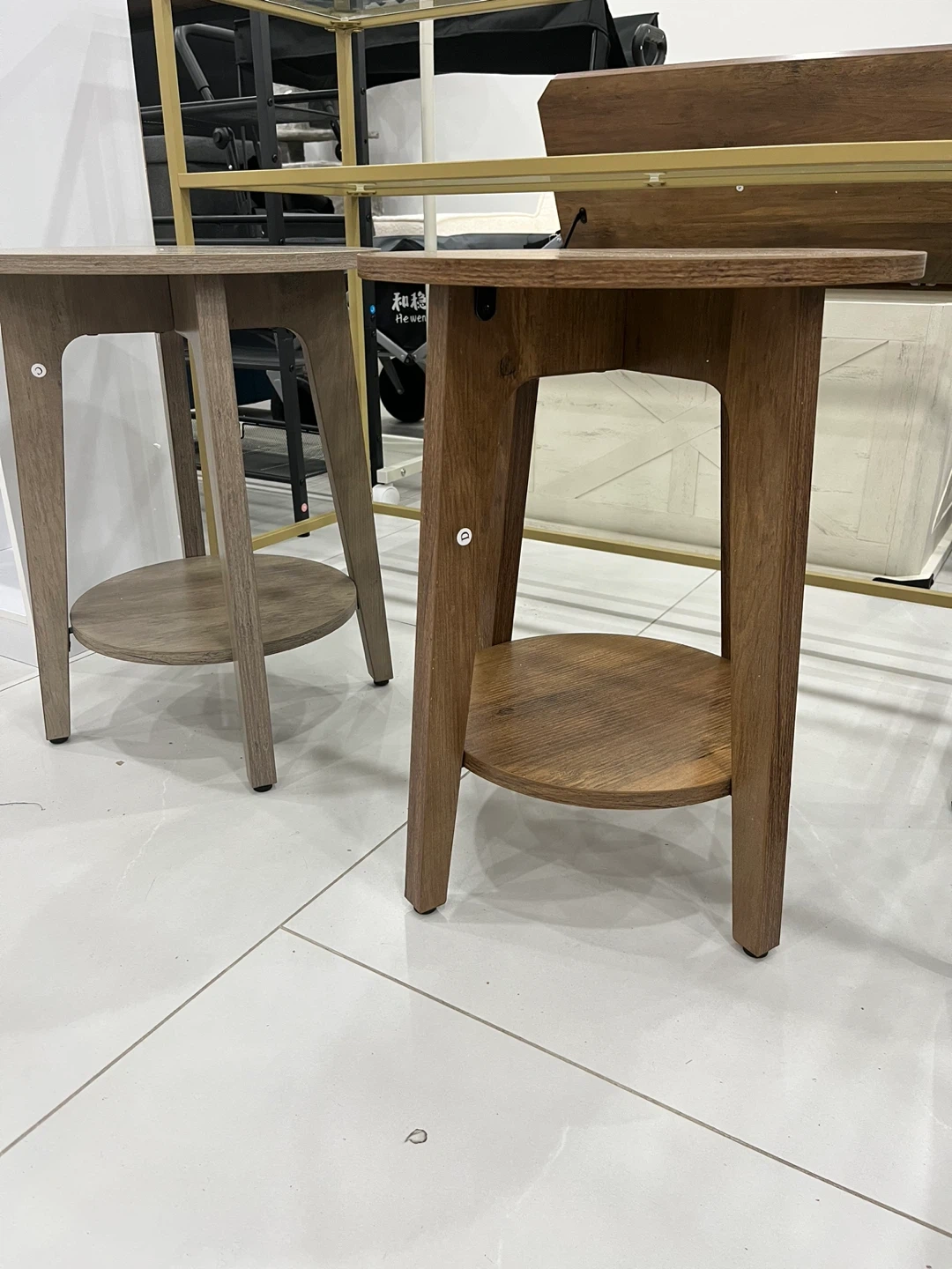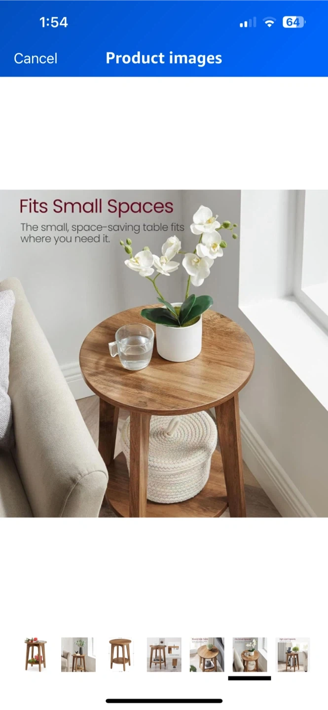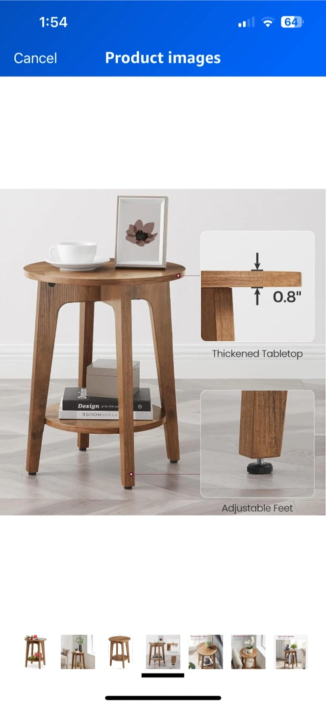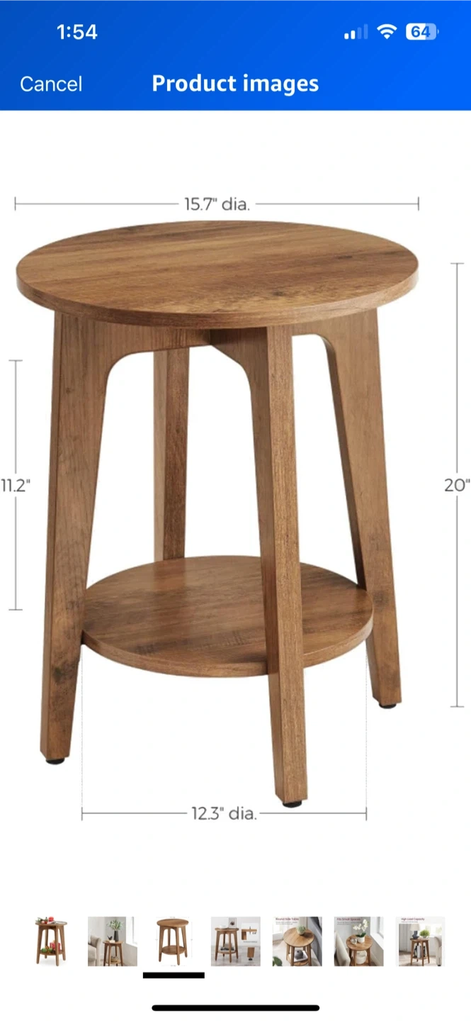 Selling wood round end table with a shelf. It's perfect for small spaces and has adjustable feet. The tabletop is 0.8" thick. It measures 15.7" in diameter and is 20" tall. The shelf is 12.3" in diameter