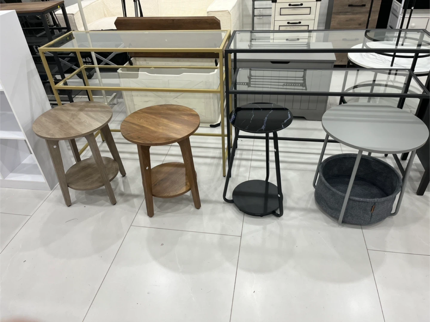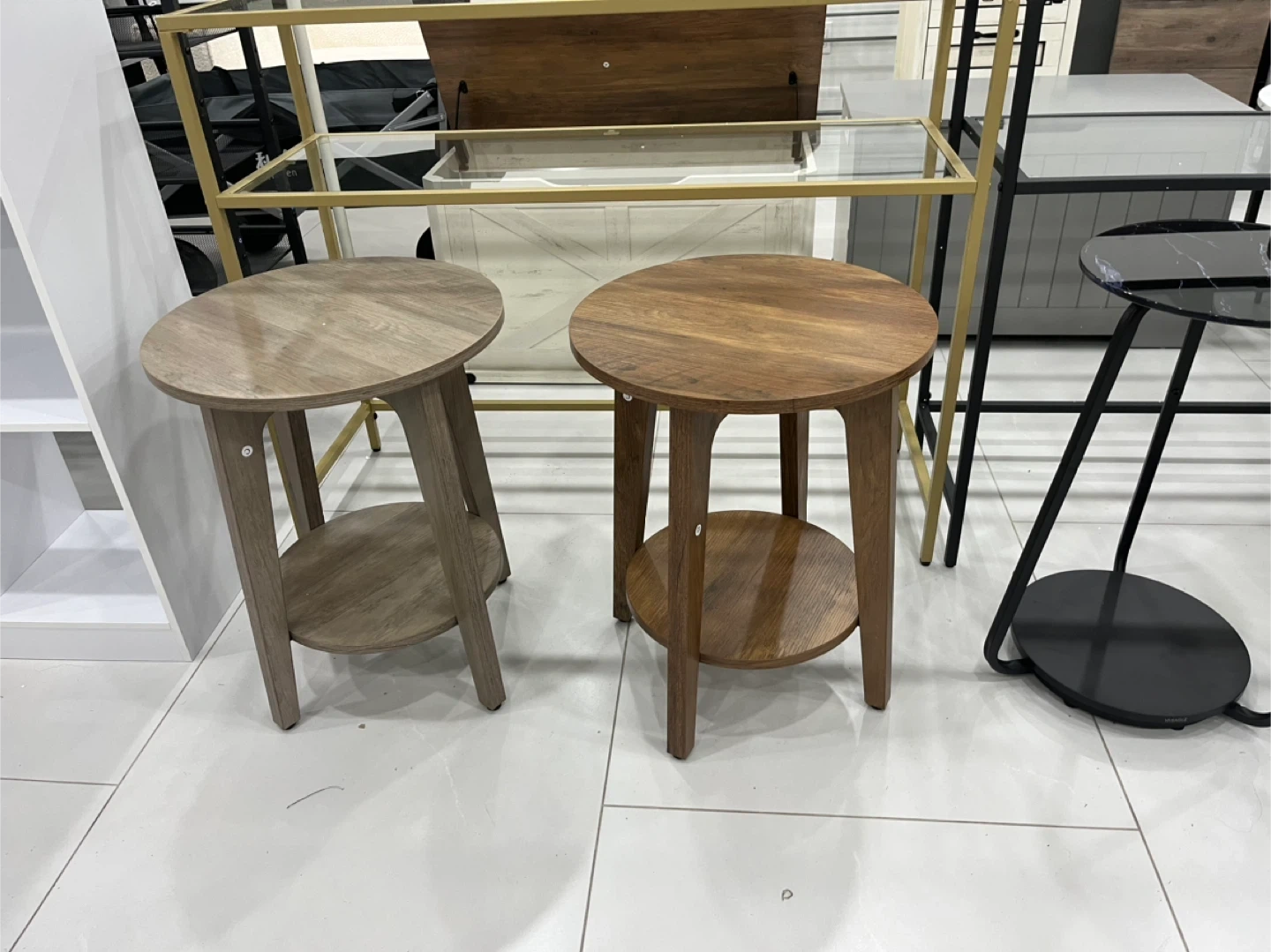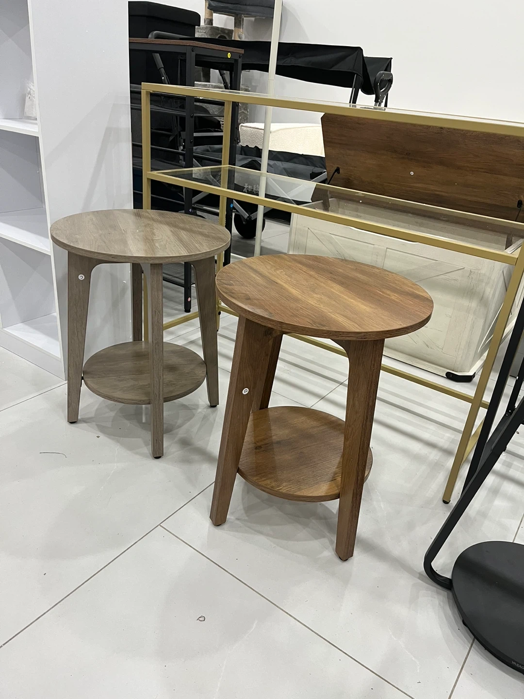 Selling wood round end table with a shelf. It's perfect for small spaces and has adjustable feet. The tabletop is 0.8" thick. It measures 15.7" in diameter and is 20" tall. The shelf is 12.3" in diameter