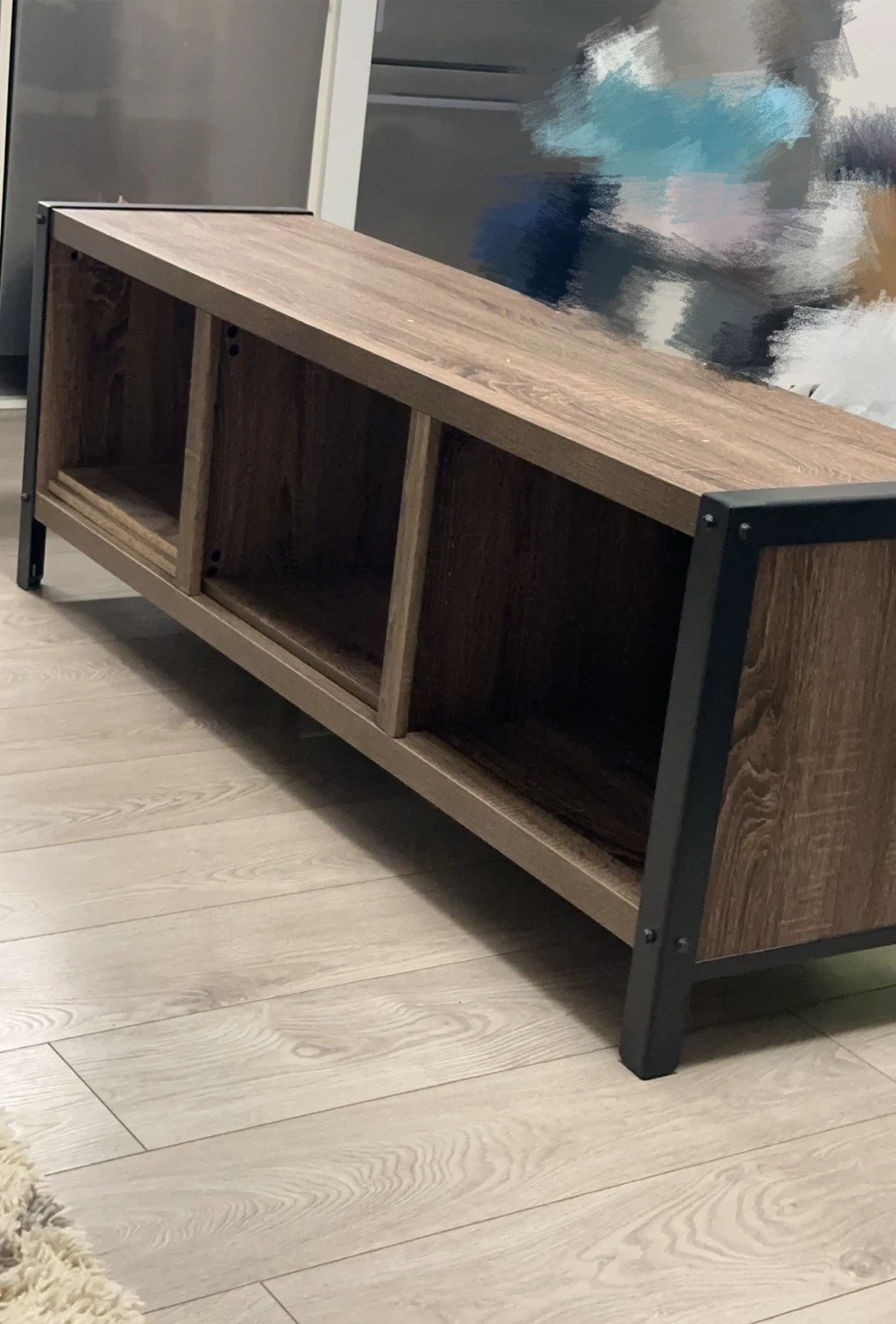 Selling a wood TV stand with storage. It features a brown wood grain finish with black metal accents. It has three open storage compartments, perfect for media devices or decor