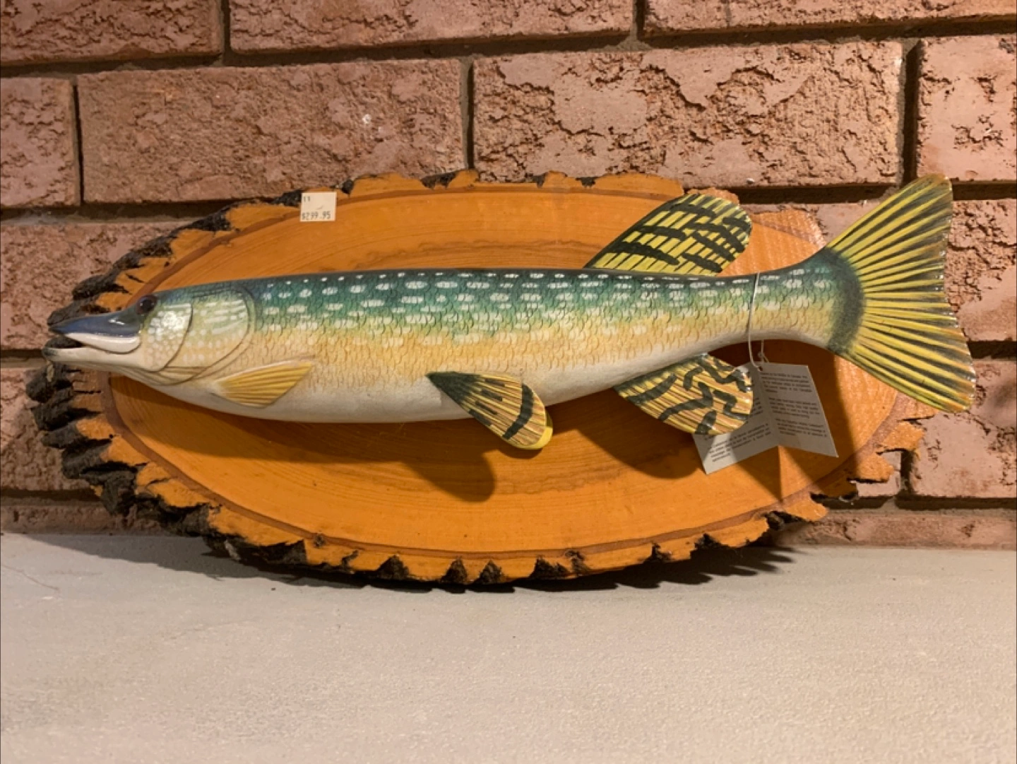 One of kind hand carved and hand painted pike fish wall decor piece mounted on a rustic wood base. The original price tag $299.95.