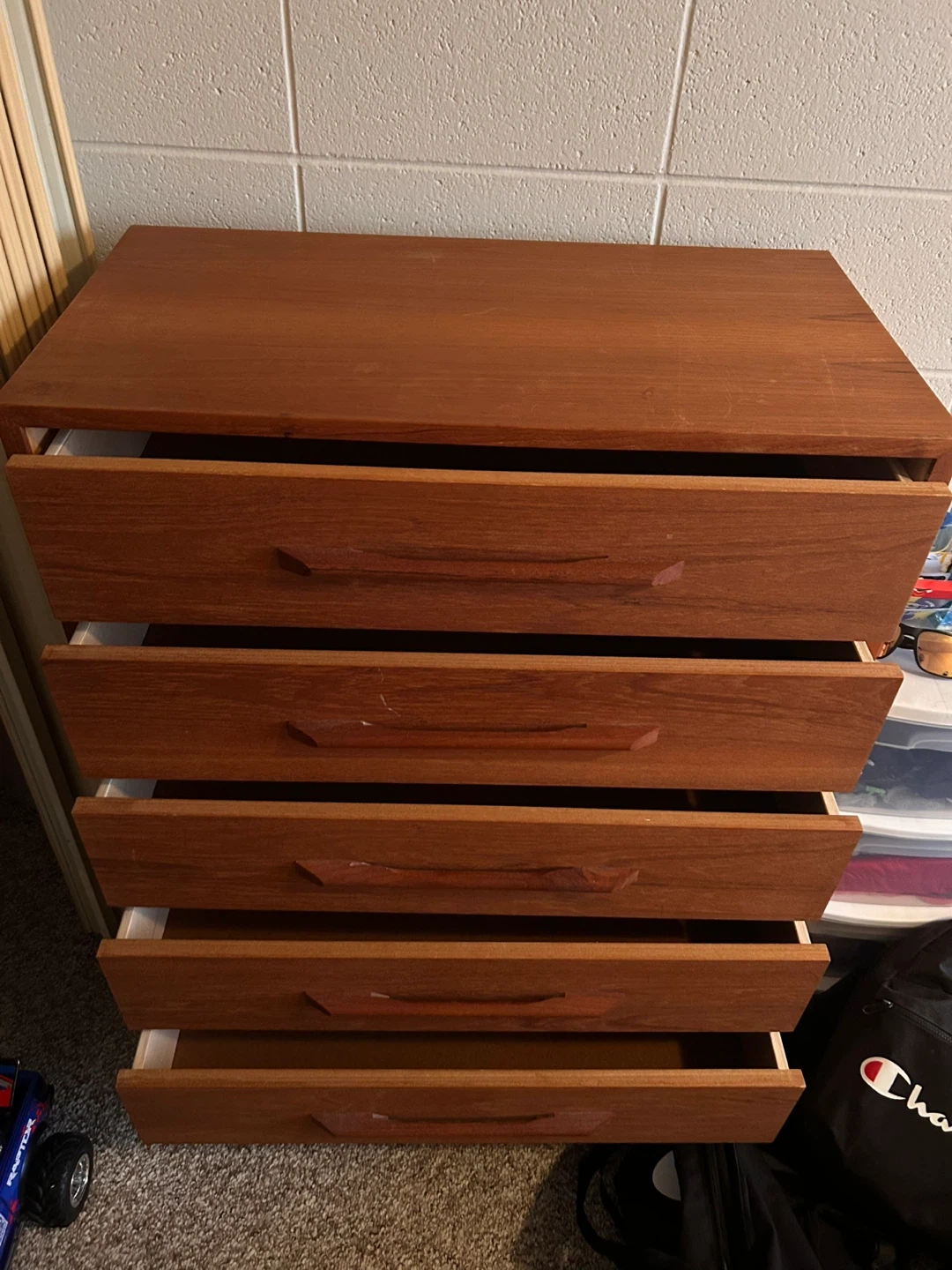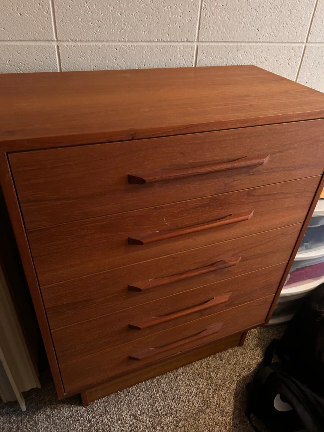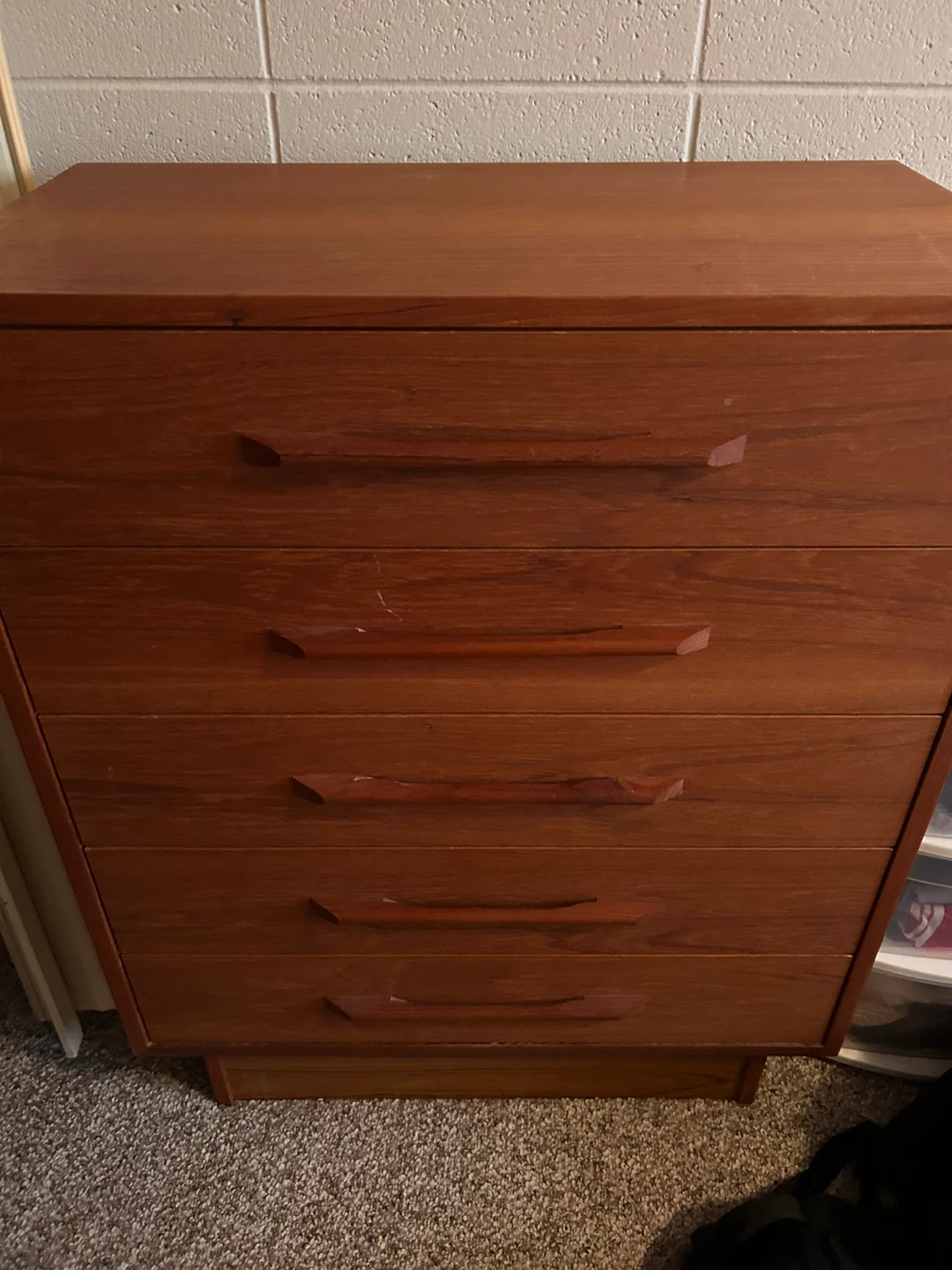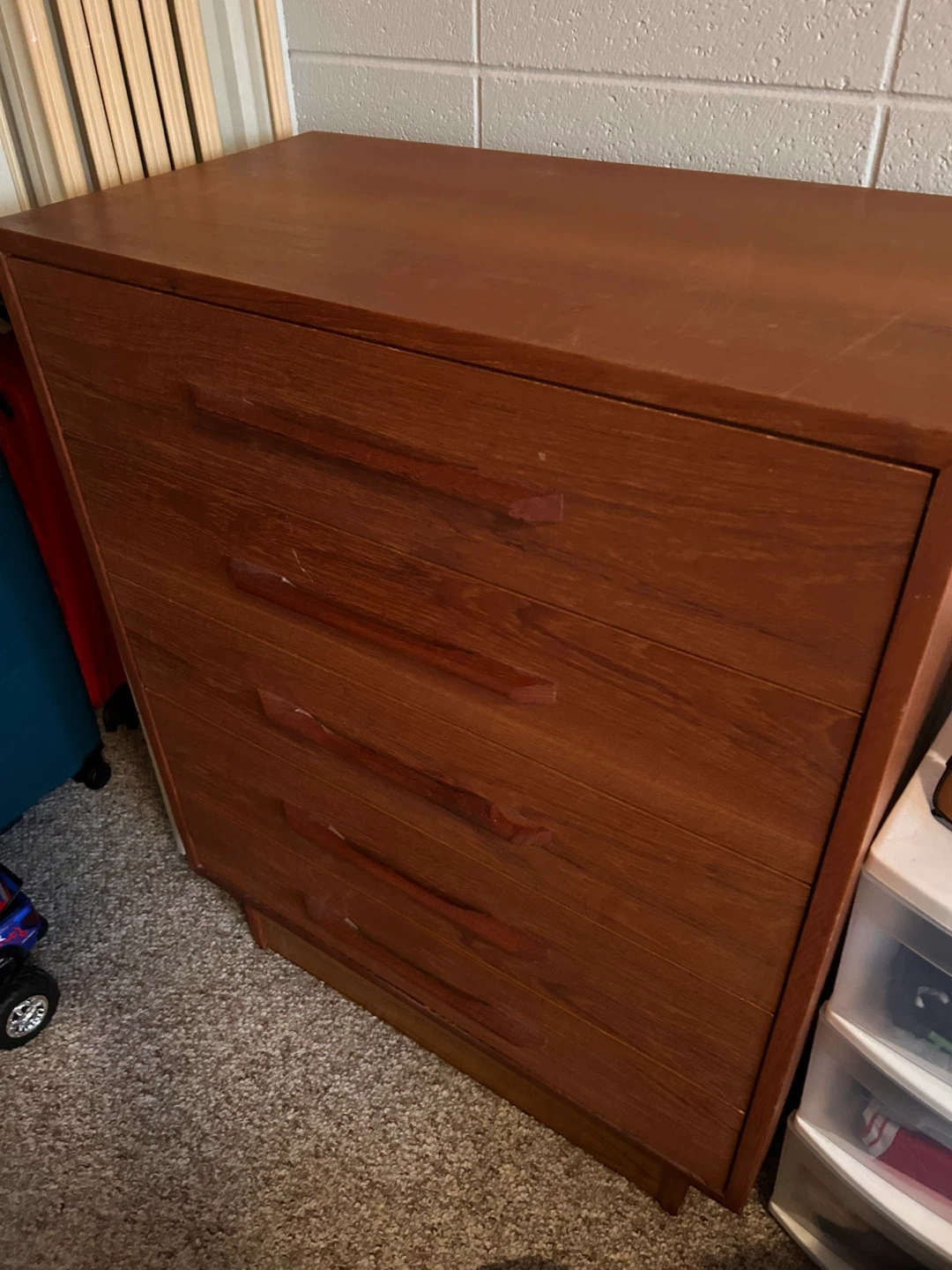 Selling a wooden dresser with five drawers. It has a classic design and could be a great addition to any bedroom. There are some signs of wear, as pictured, but it's still very functional and sturdy