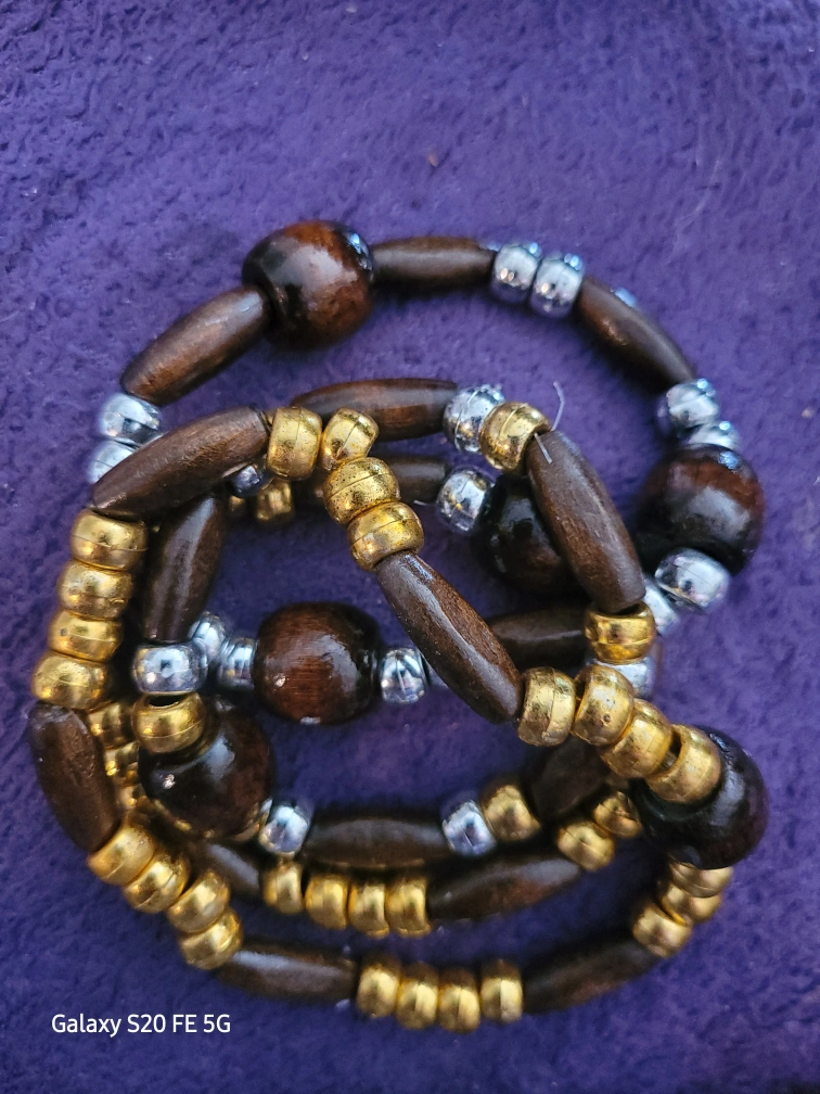 Selling a bracelet featuring wooden beads in a dark brown colour, accented with gold and silver coloured beads. It's in good condition and would make a great addition to your jewellery collection! will not answer to phone calls but will answer to texts or karrots messages