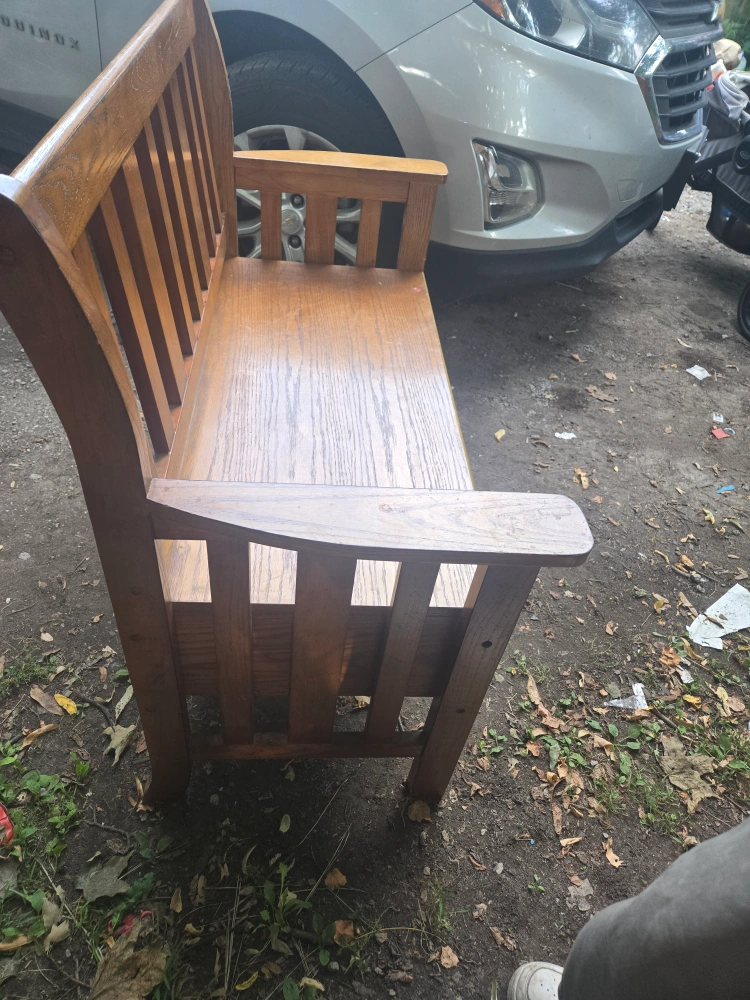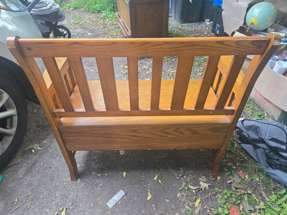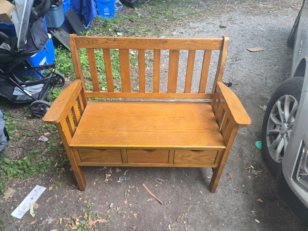 Here's a sturdy wooden bench with built-in storage! It's perfect for an entryway, mudroom, or anywhere you need a little extra seating and storage. It has a warm, natural wood finish. It's in good condition and ready for a new home!