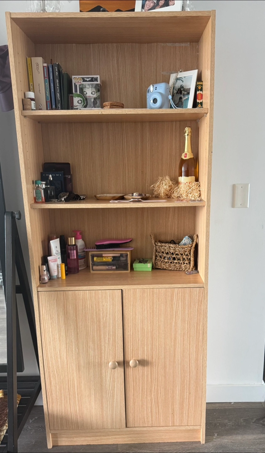 Selling a wooden bookcase with a cabinet at the bottom. It's in great condition and provides ample storage space for books and other items. Perfect for organizing your home or office!