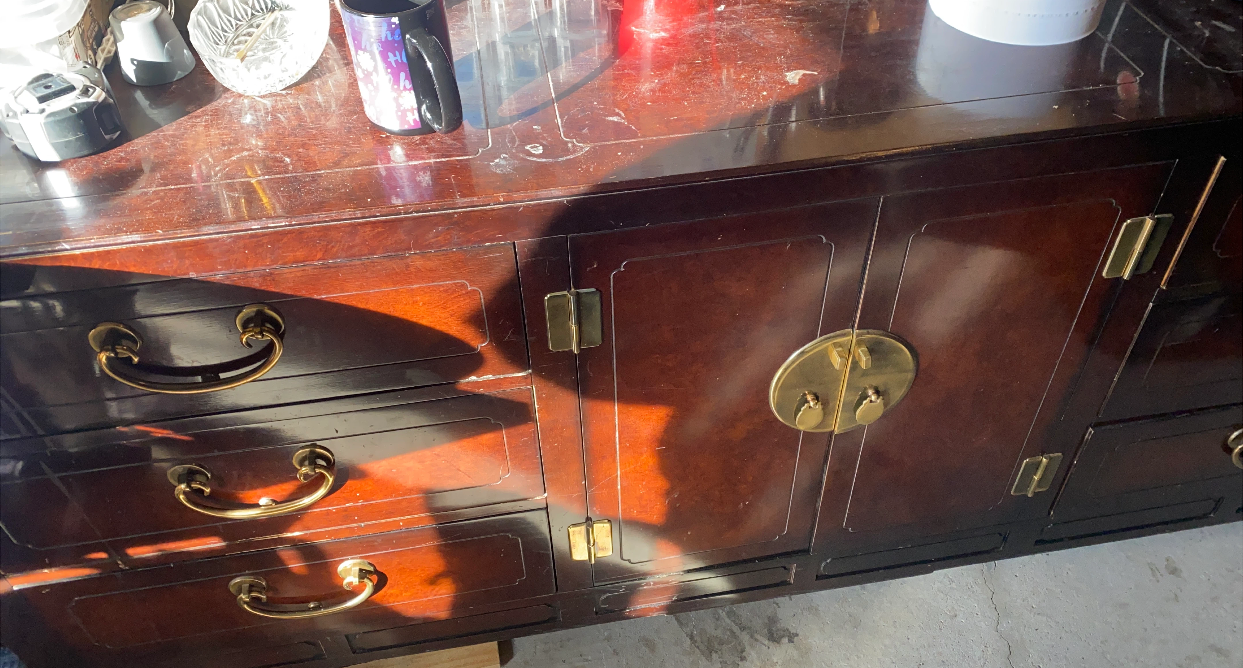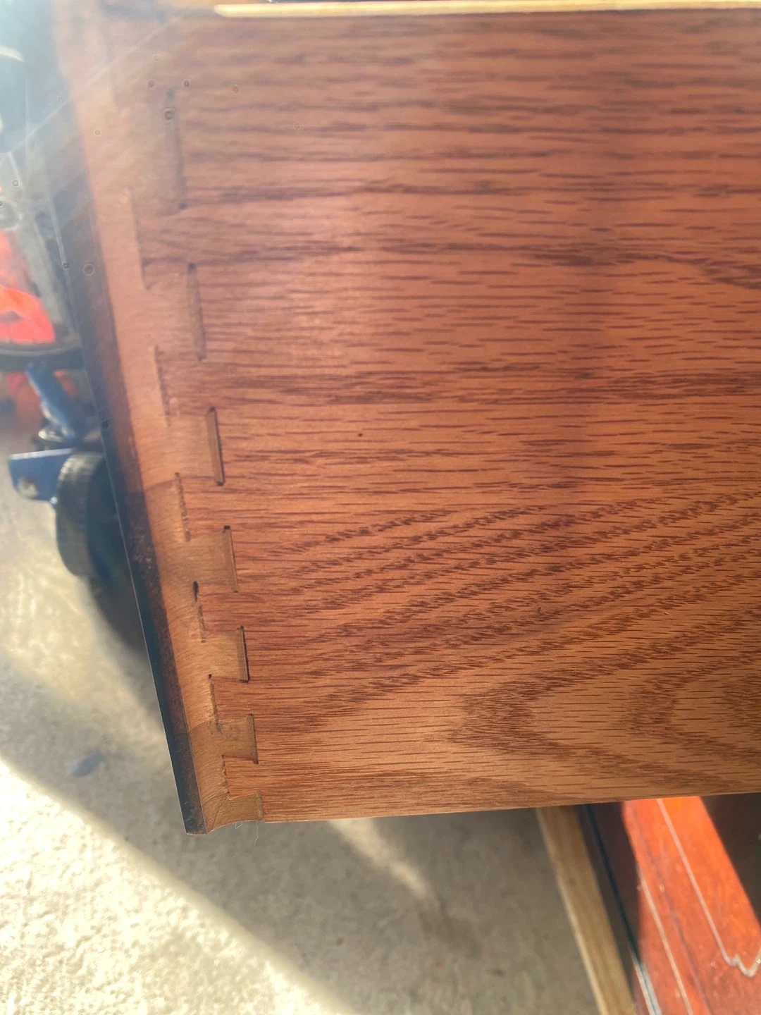 Selling a wooden cabinet with drawers. It has a unique design with drawers on one side and doors on the other. The wood has a beautiful grain pattern, and the dovetail joints show quality craftsmanship. It's a great piece for storage and adds a touch of elegance to any room