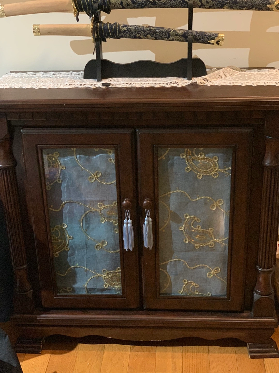 Selling a lovely wooden cabinet. It has two doors with glass.The cabinet also has decorative tassels and stands on sturdy legs. Perfect for adding a touch of elegance to any room!