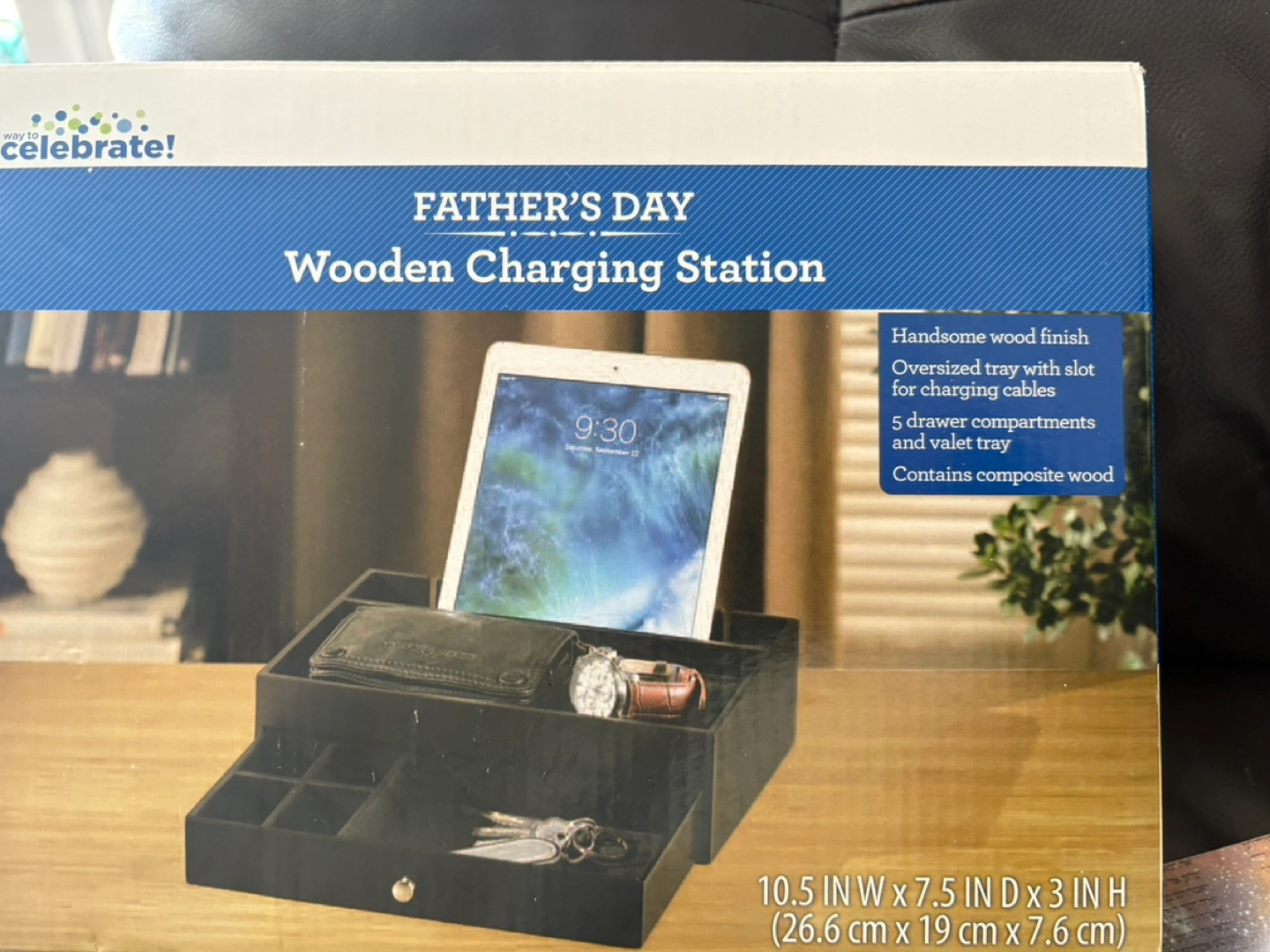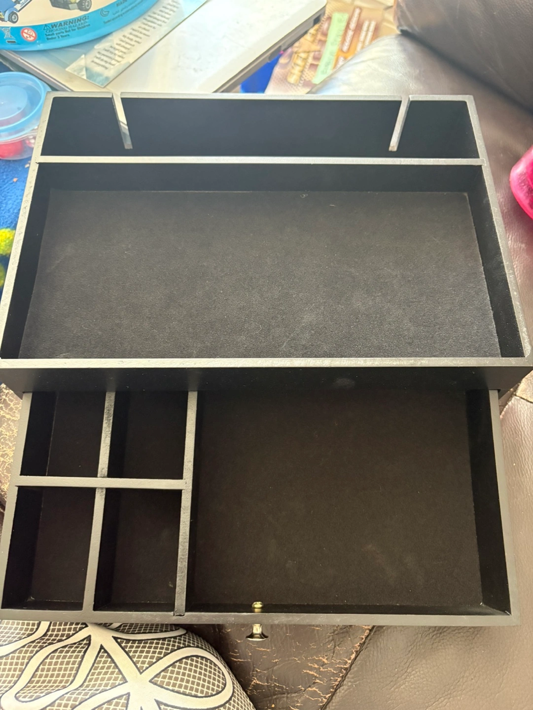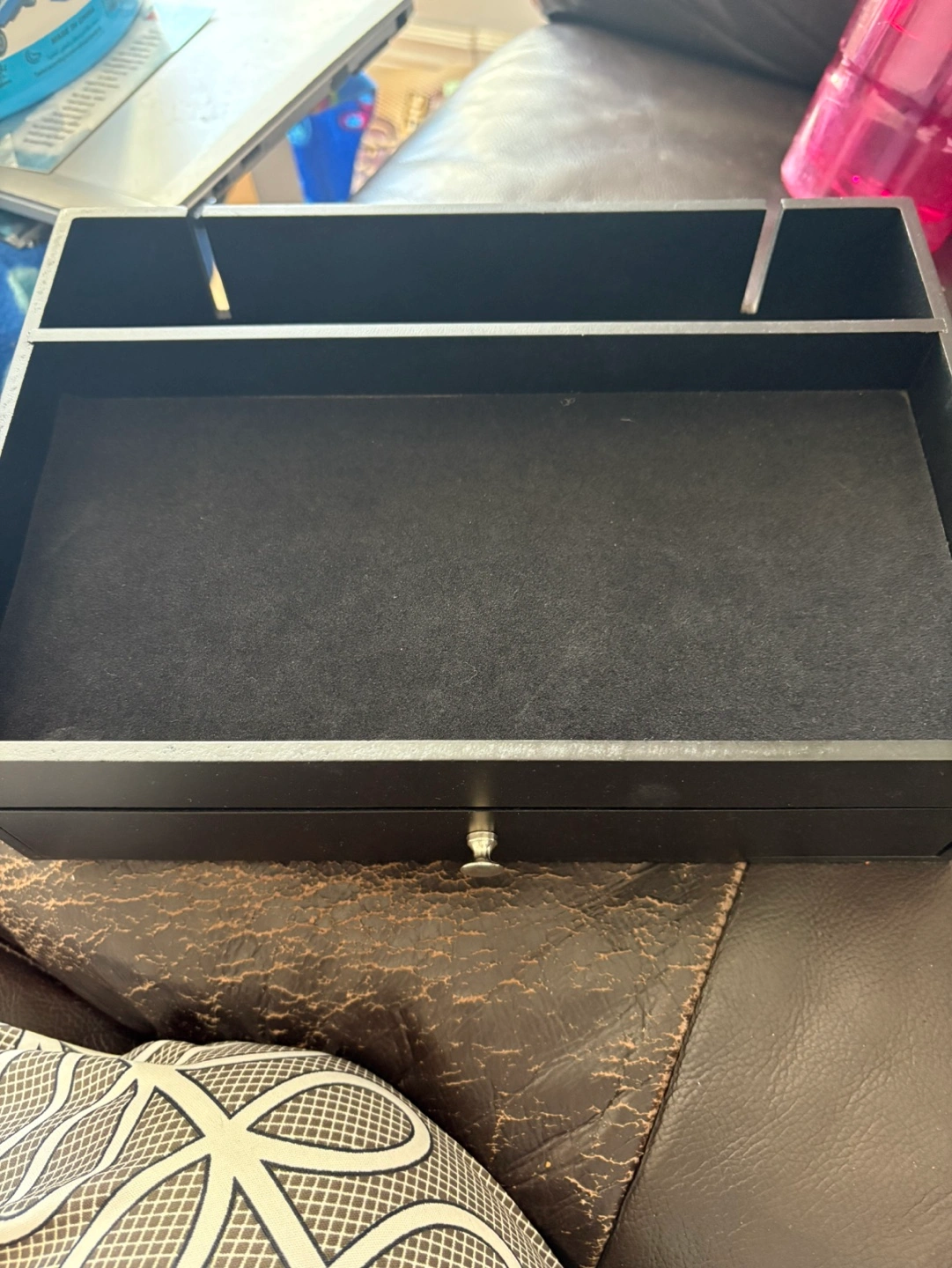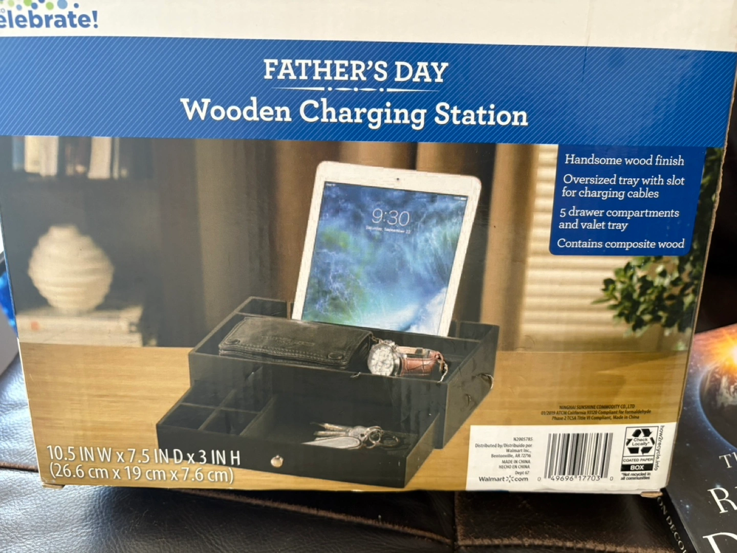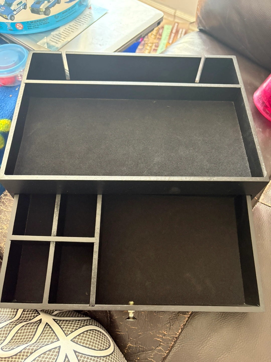 New in box. Handsome wood finish. Oversized tray with slot for charging cables. Five drawer compartments and valet tray. Contains composite wood. Dimensions: 10.5"W x 7.5"D x 3"H (26.6 cm x 19 cm x 7.6 cm)