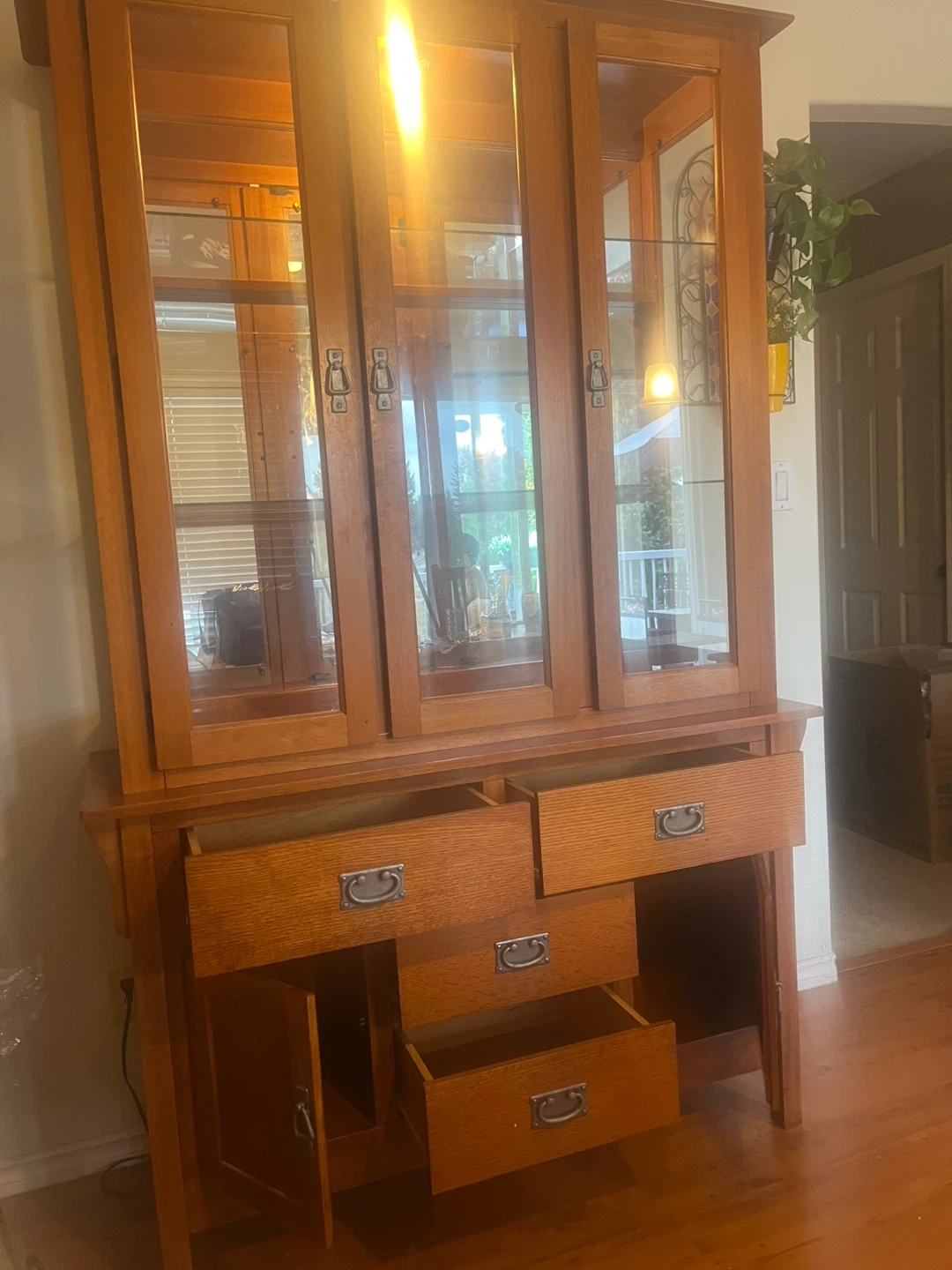 Selling a beautiful wooden china cabinet! It's perfect for displaying your favourite dishes and glassware, and it also has drawers and cabinets for storage. A great addition to any dining room or kitchen