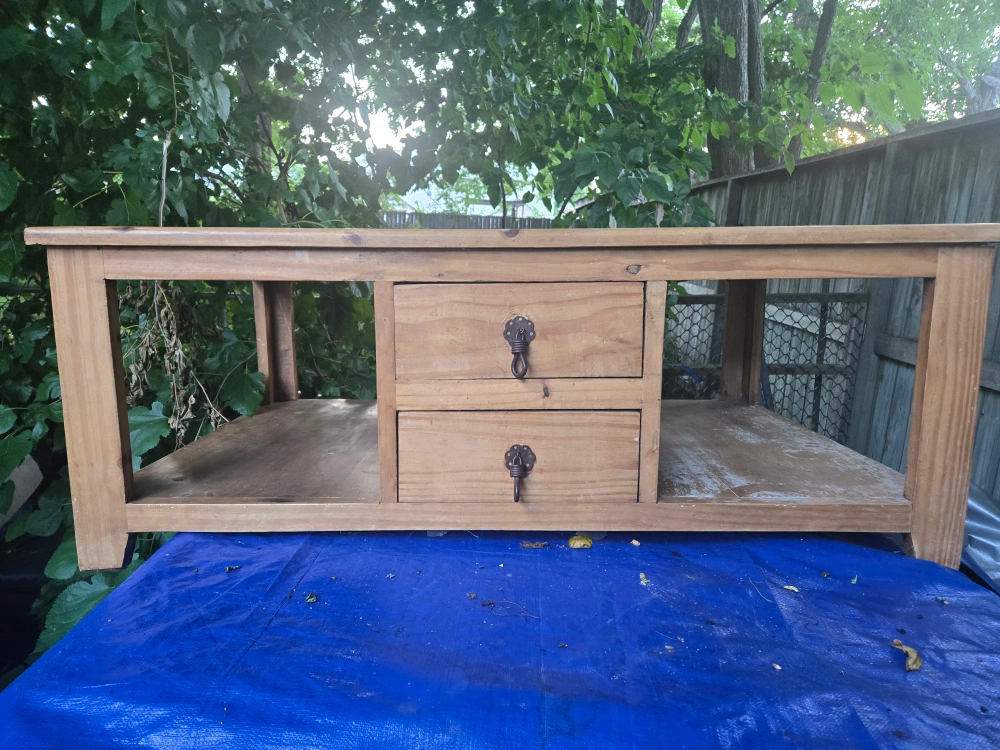 Selling a wooden coffee table with two drawers. It's a sturdy piece with a classic design that would look great in any living room. The table has a nice, natural wood finish and the drawers add a touch of functionality for storing remotes or other small items
