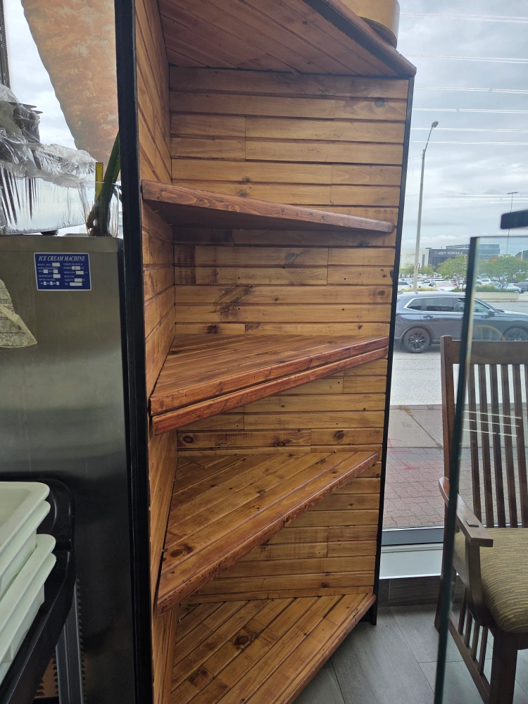 Selling a wooden corner shelf, perfect for adding some rustic charm to your space! It features three shelves and a sturdy black metal frame. It's in great condition and ready to find a new home hand made very strong very good quality.