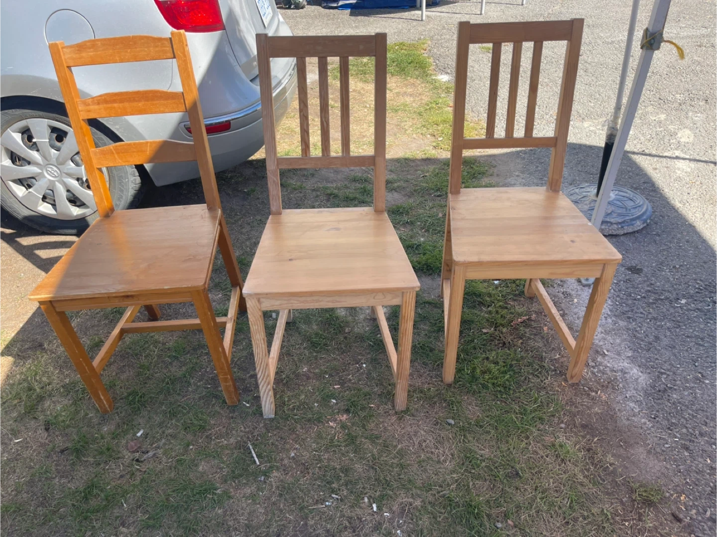 Selling a set of three wooden dining chairs. They are sturdy and in good condition, perfect for a kitchen or dining room! The chairs have a classic design and are made of solid wood. There are some minor signs of wear, but overall they're ready for a new home