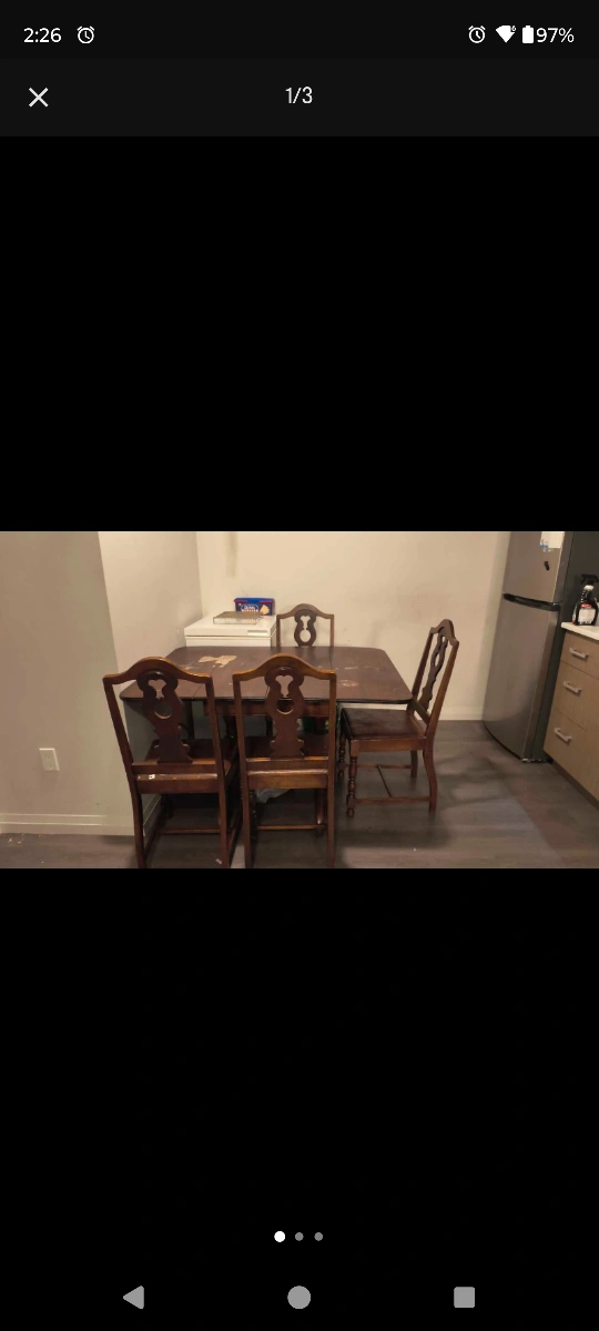 Selling a wooden dining table with chairs. The set shows signs of wear and tear on the tabletop we usually just put a table cloth on it . It's a sturdy set perfect for a starter home or a kitchen refresh. Please take a look at the photos for details on the condition pick up only ! 100$ or best offer fastest pick up as we are moving .