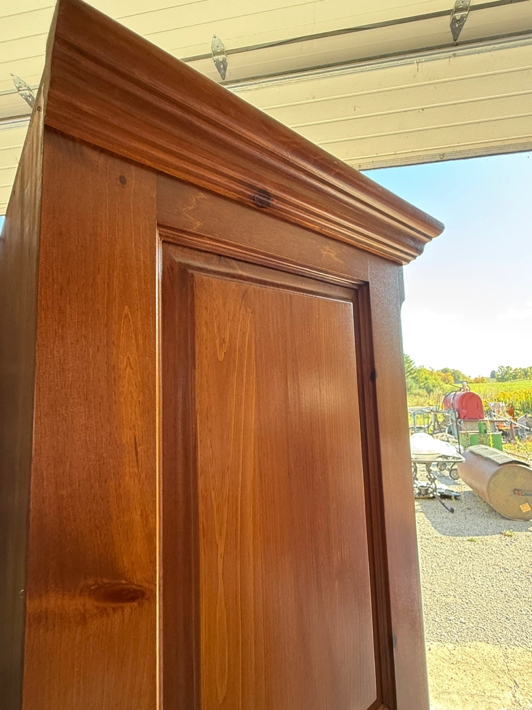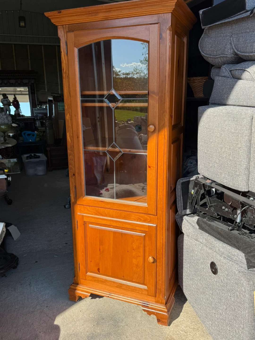 Here's a lovely wooden display cabinet! It features a glass door with a decorative diamond pattern. It has multiple shelves inside for displaying your favourite items. The wood has a warm, honey-toned finish. Perfect for adding a touch of elegance to any room!