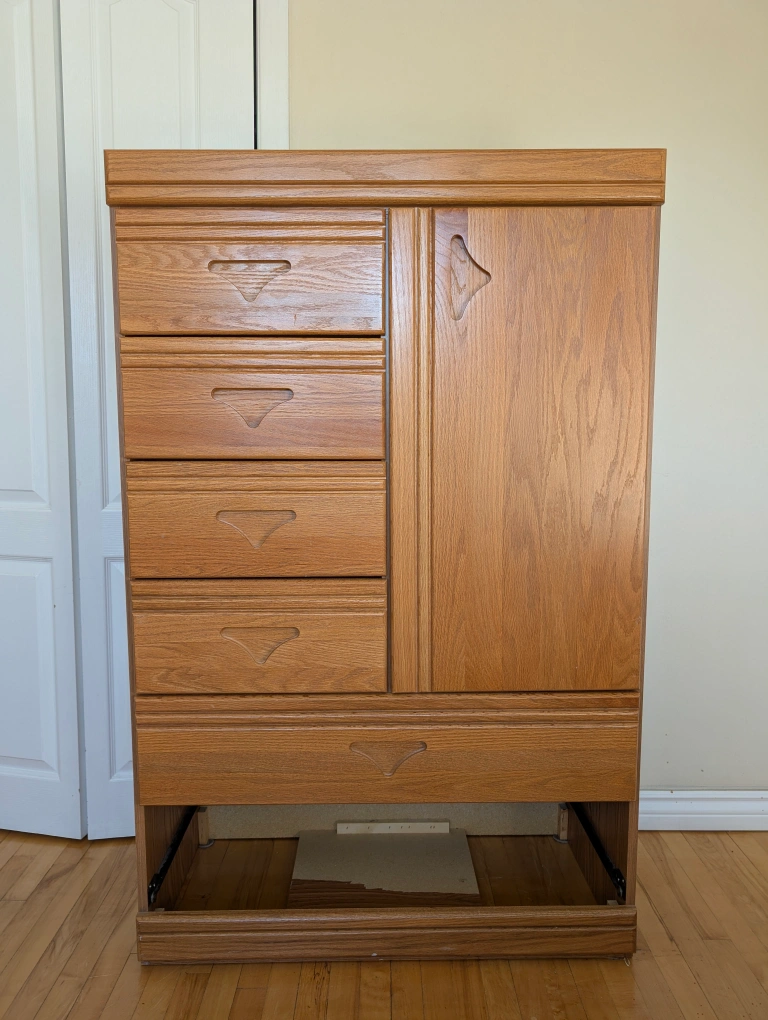 Here's a lovely wooden armoire with several drawers and a cabinet! It's perfect for adding some extra storage to your bedroom or living space. The wood has a nice, warm tone that would fit in with many decor styles. It's in good condition and ready for a new home Solid wooden dresser Heavy Pickup only.