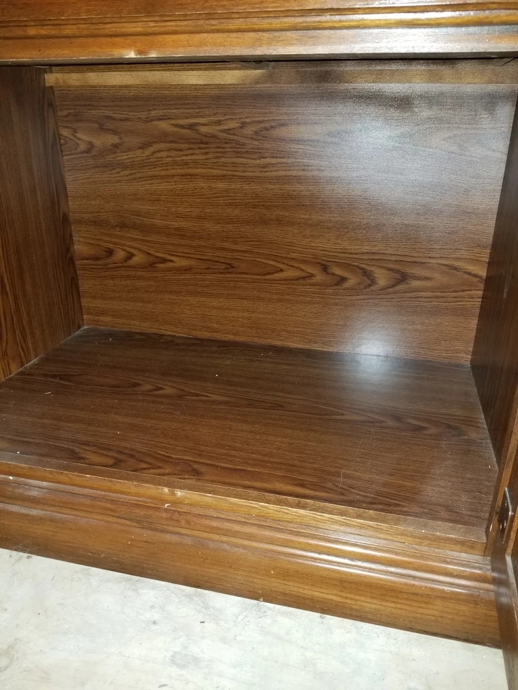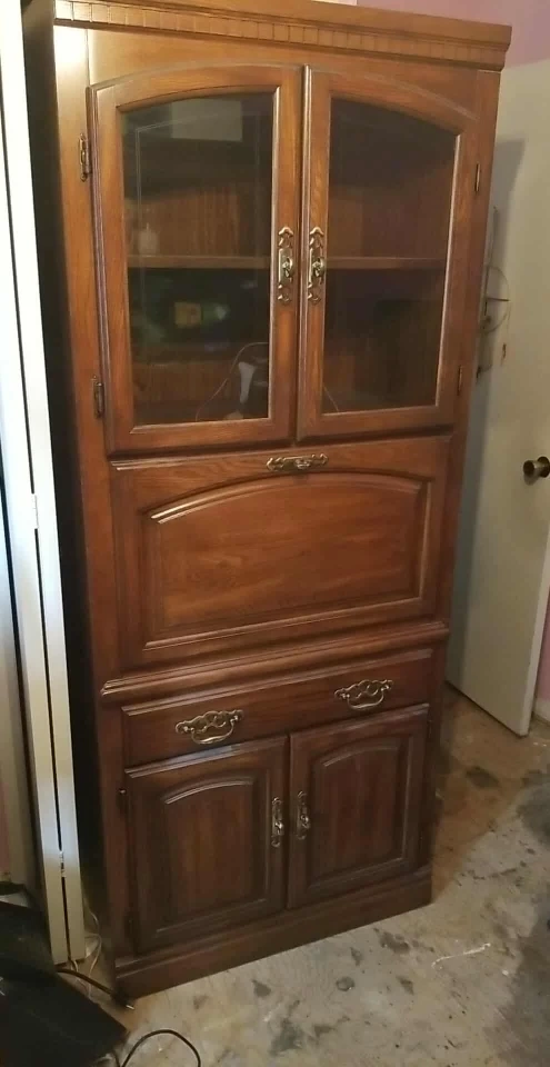 Selling a wooden hutch cabinet. It features glass doors on the upper section, writers desk and cabinets on the lower section. Also has a built in light. The wood has a nice warm tone. 31 inches W x 76 inches H x 18 and 1/2 inches front to back. Pu in St. Catharines Ontario, a dolly is required to move it.