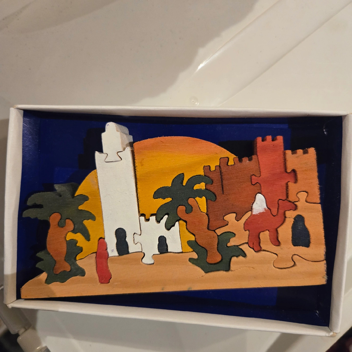 A cute little wooden puzzle depicting a desert scene with palm trees, a camel, and a building! It's in great shape and comes in its original box. It was made in Morocco
