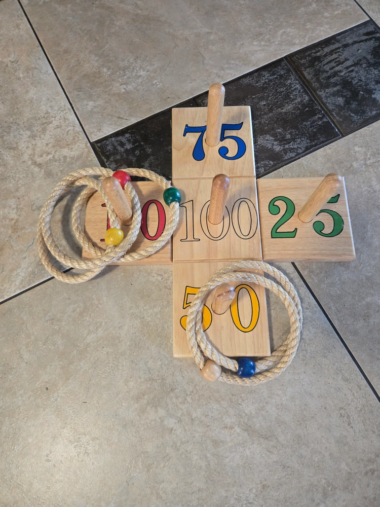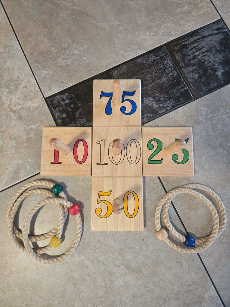Here's a fun ring toss game! It includes wooden number blocks and rope rings. Perfect for some outdoor fun with the family!