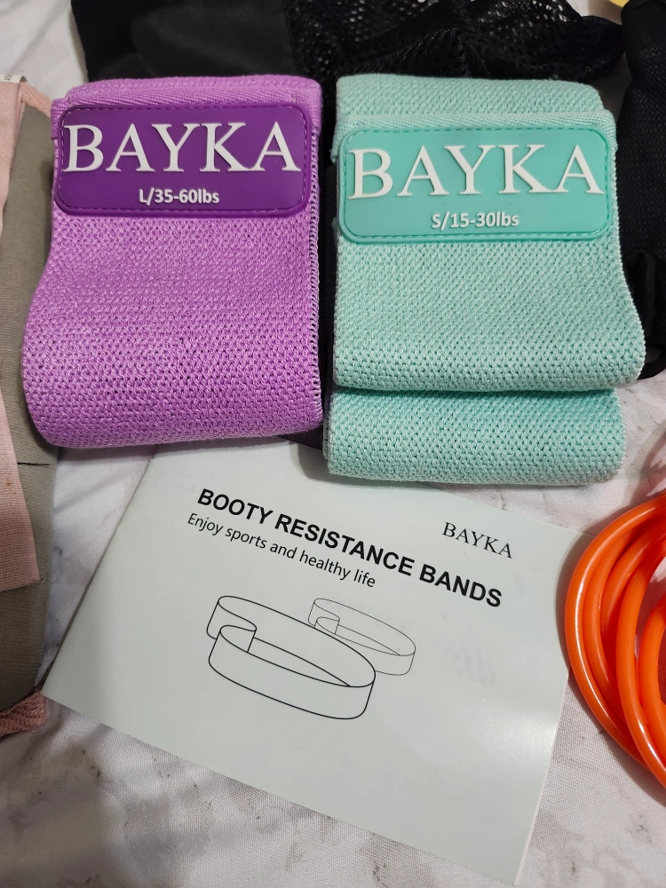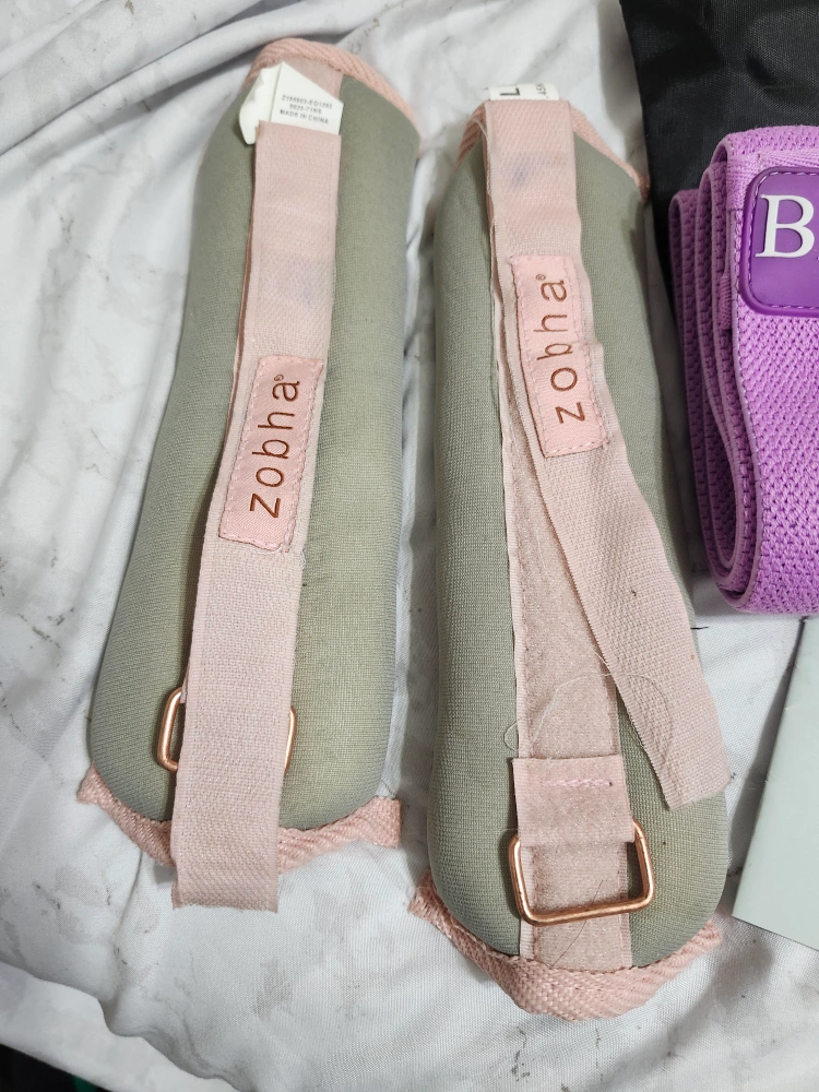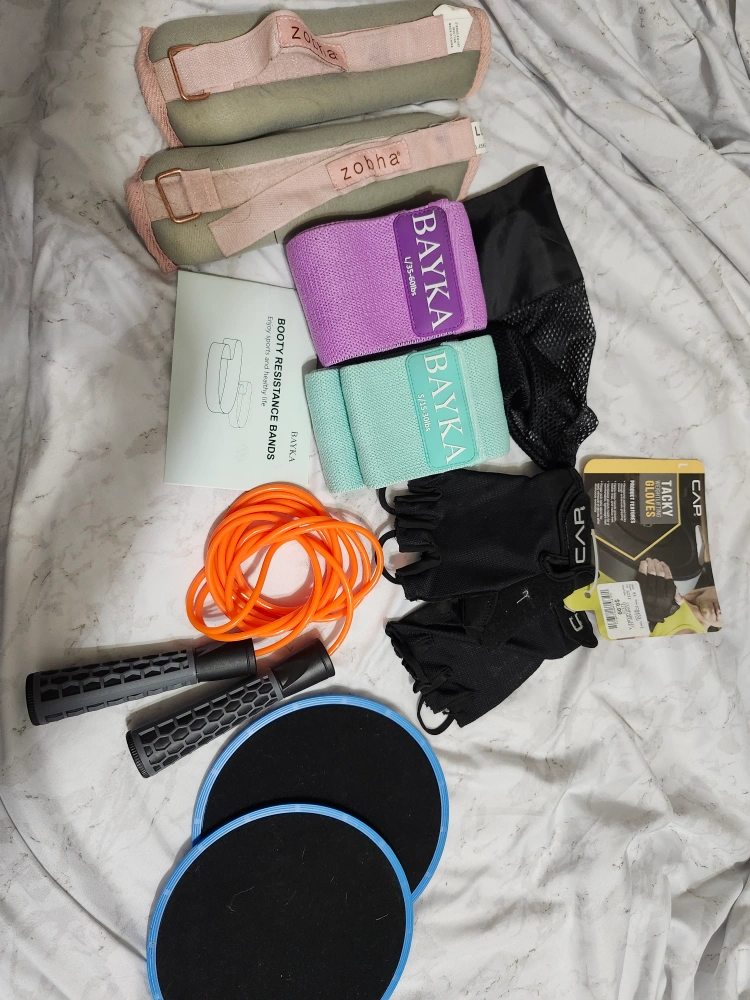 Set of fitness equipment including resistance bands, a jump rope, sliding discs, leg weights and workout gloves.
