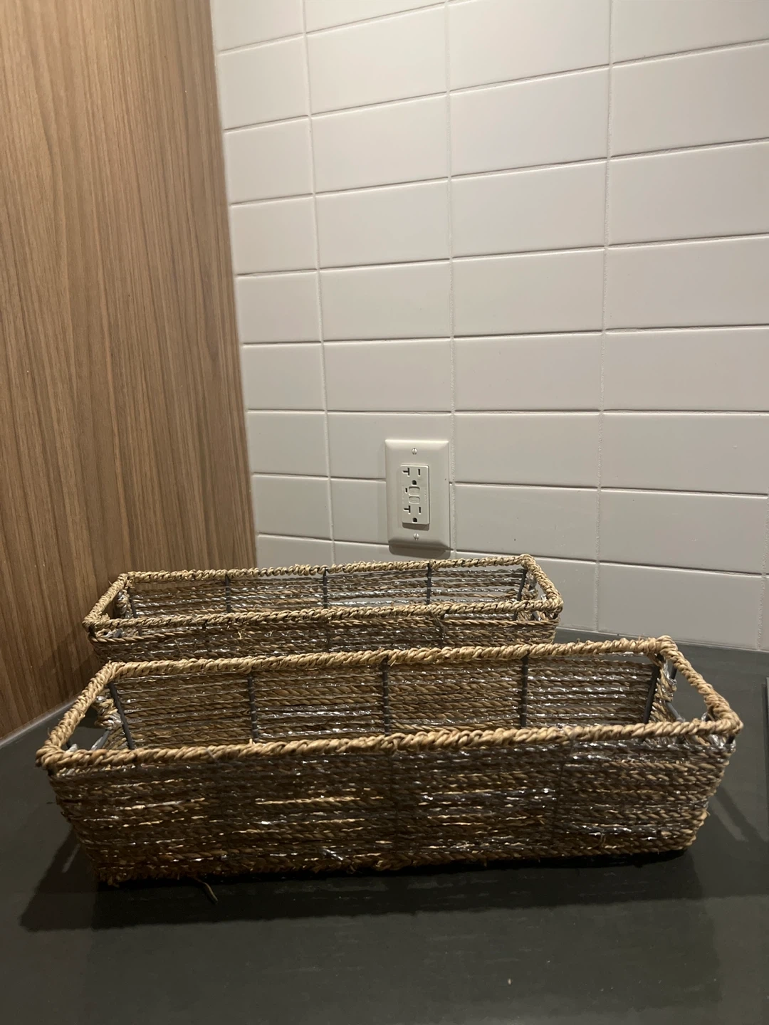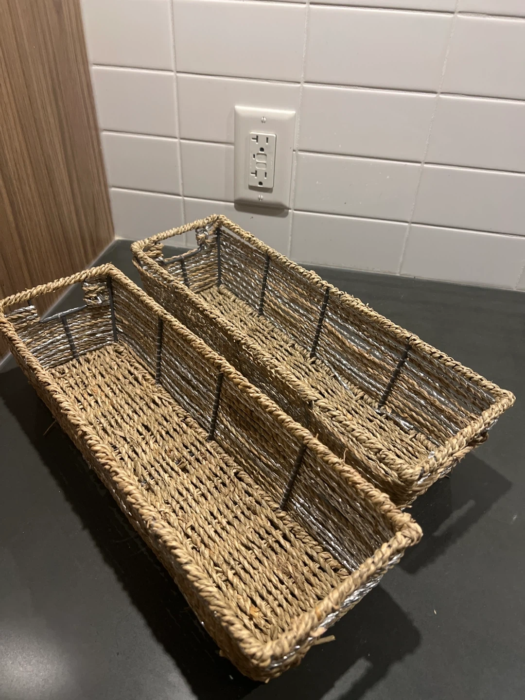 Selling a set of two woven baskets. They're in great shape and perfect for organizing small items around the house. They have a natural, rustic look that would fit well in any room