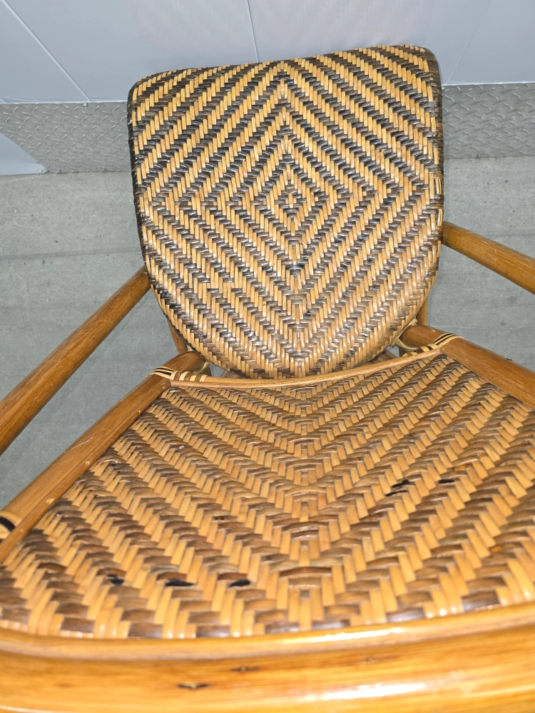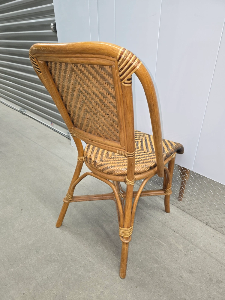 This is a woven rattan dining chair. It's perfect for adding a touch of natural style to your dining area. The chair features a unique woven design and sturdy construction and is in very good condition, in its age.