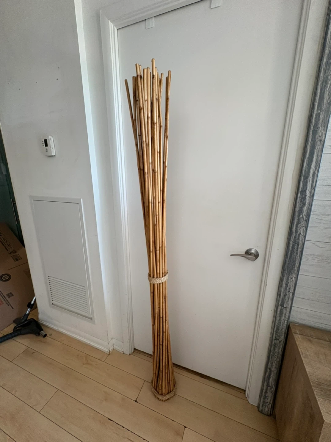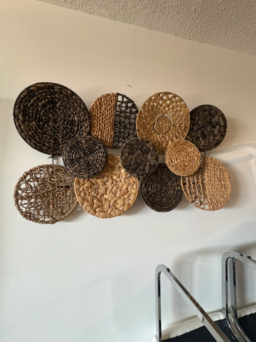 Beautiful woven plates wall decor and a bundle of bamboo sticks. They're in great shape and would look lovely in any home. Perfect for adding a natural touch to your space!