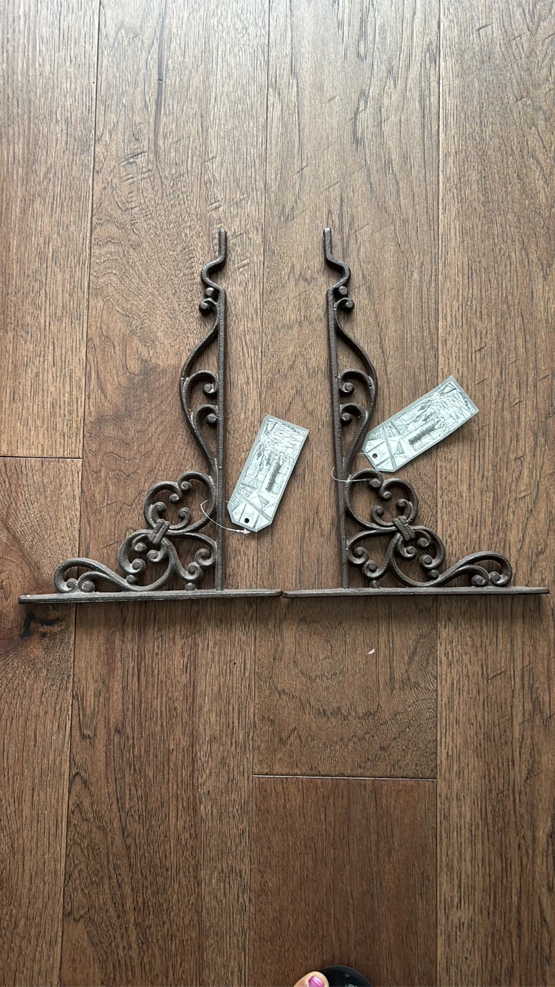 Selling a set of two brand new wrought iron shelf brackets / Plant hangers. They have a lovely decorative design, perfect for adding a touch of elegance to any room