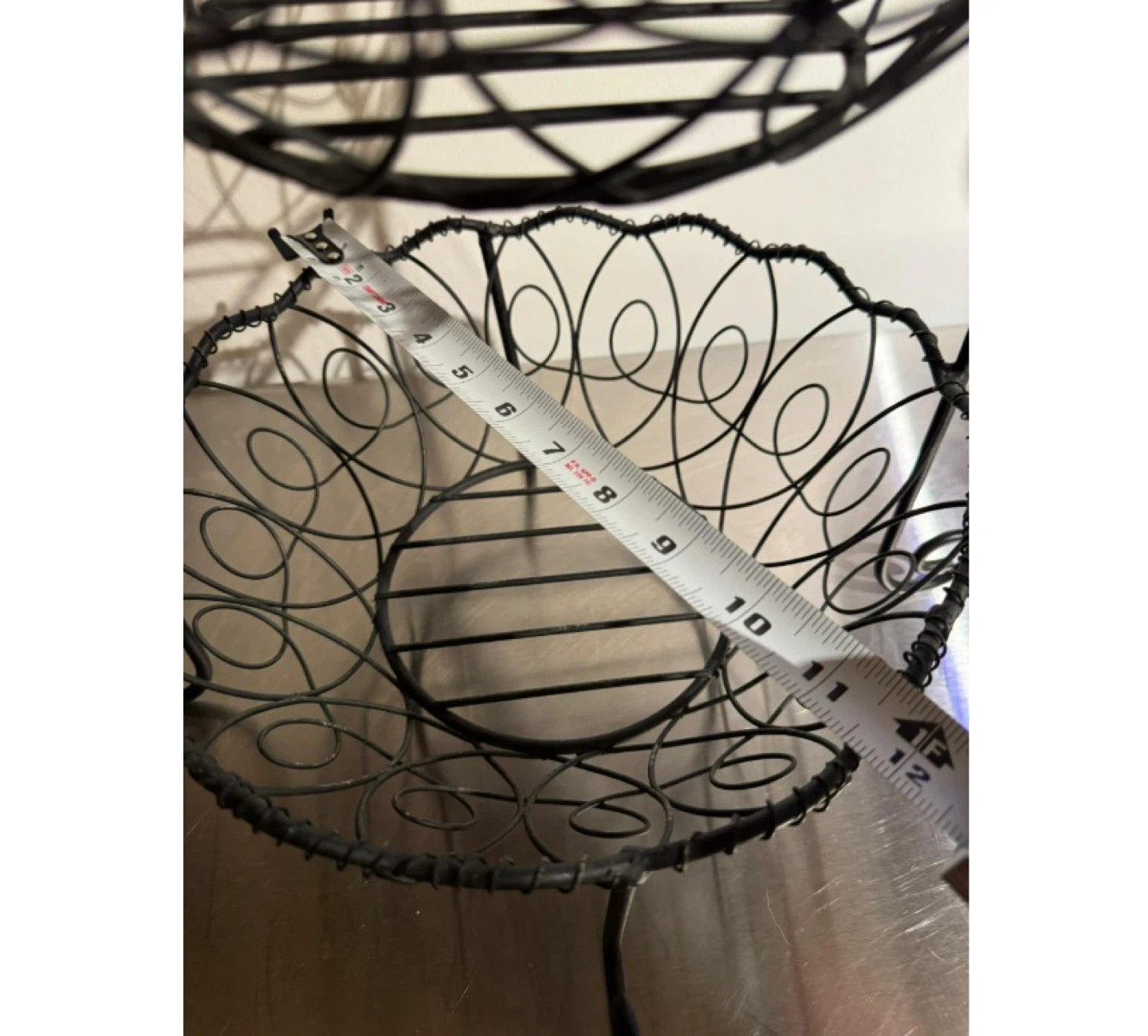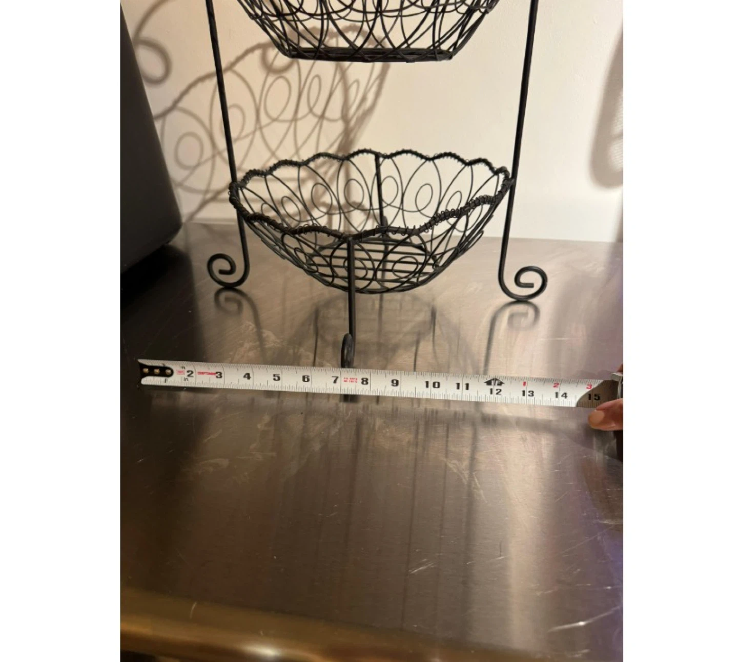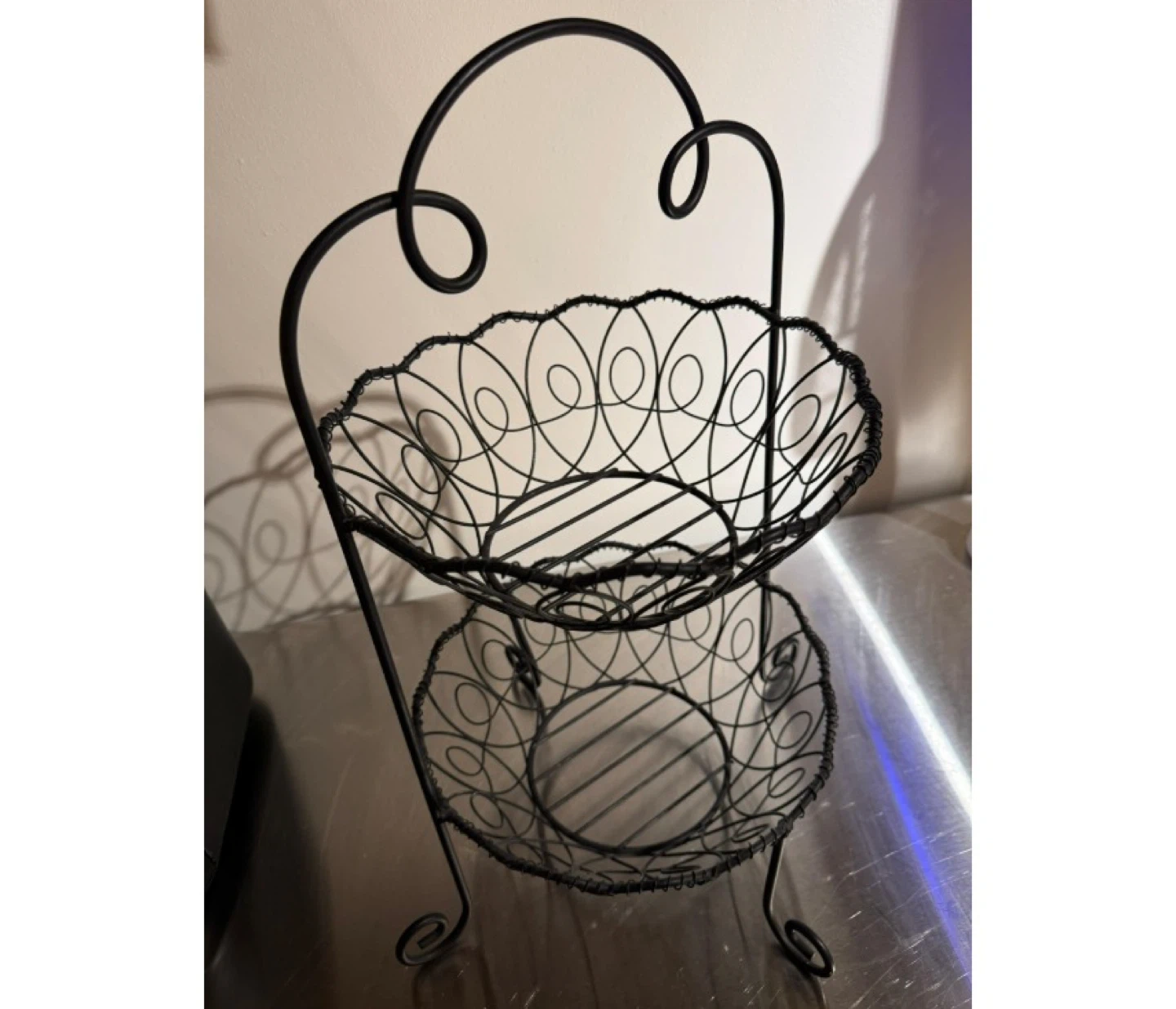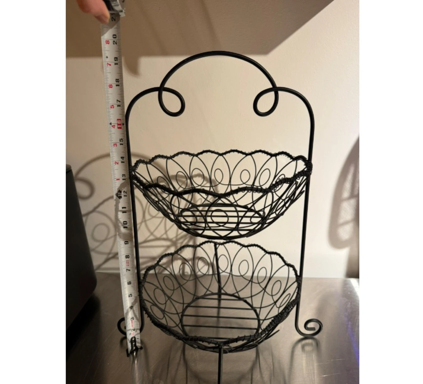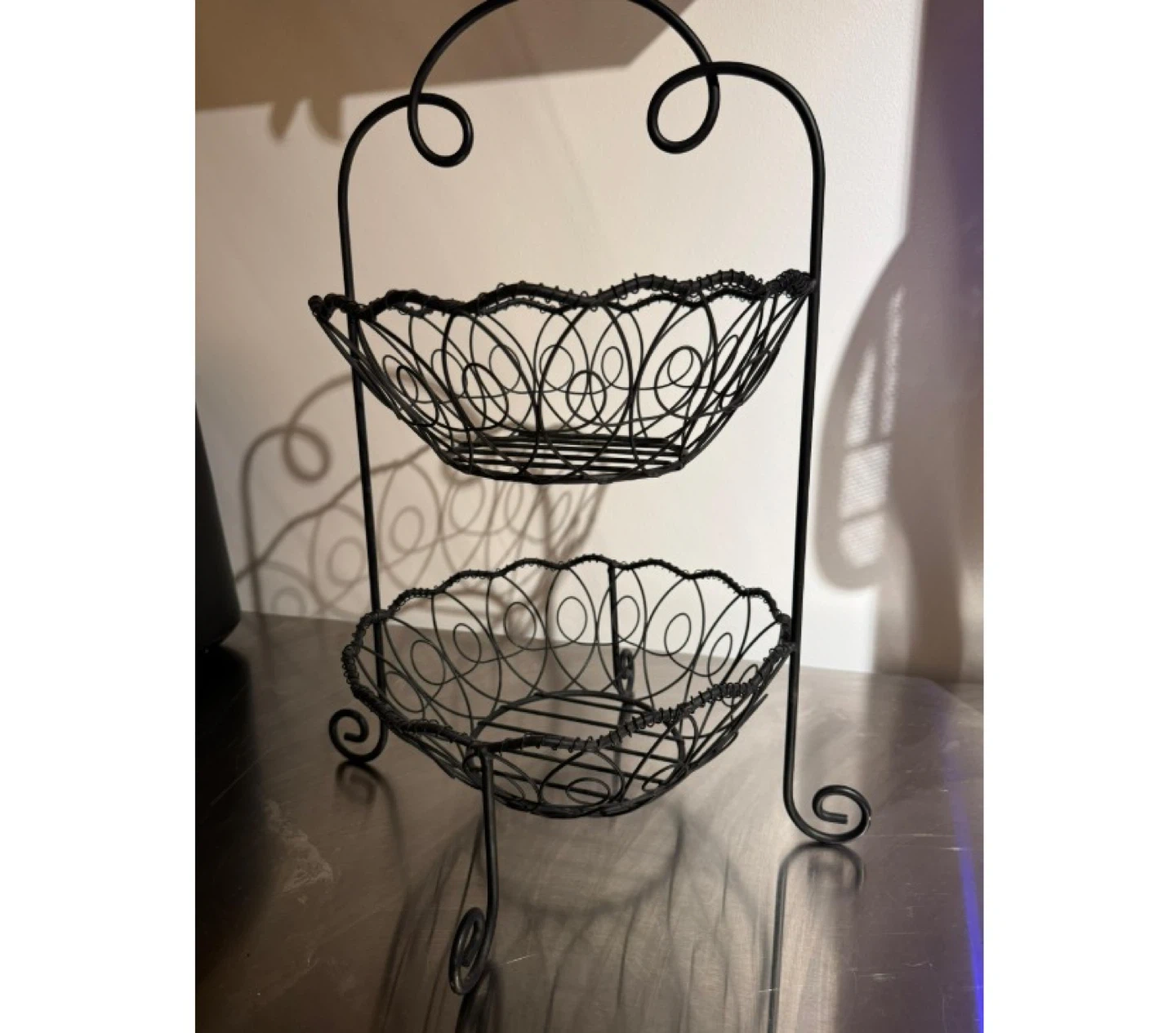 Wrought Iron Two Tier Fruit Stand About 20 inches tall, 14 inches wide, with each basket 11.5 inches across.