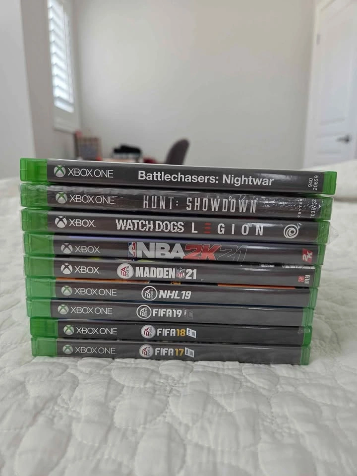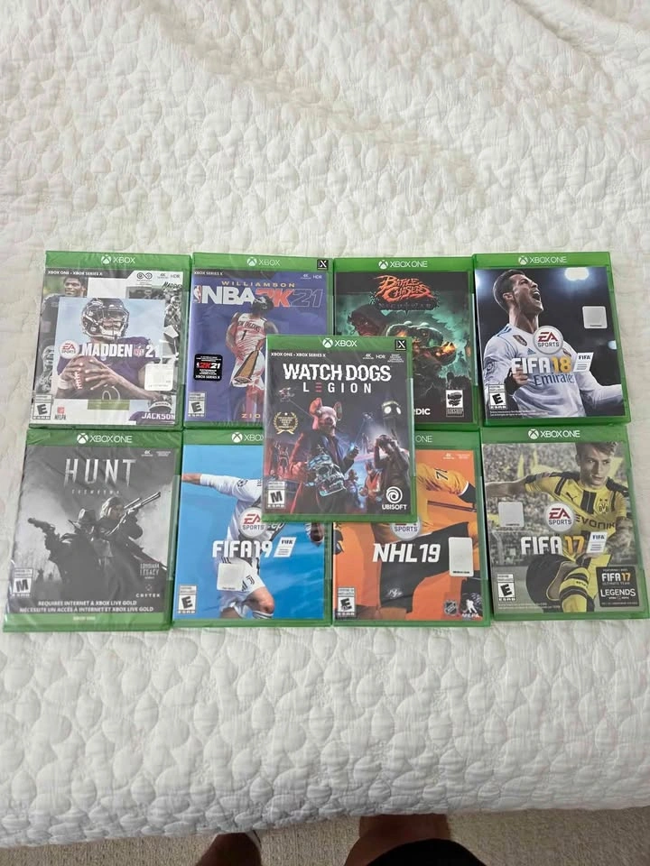 Brand new Xbox one games! Watch dogs Legion - $15 Battlechasers - $5 Fifa 17 - $5 Fifa 18 - $5 Fifa 19 - $5 Hunt showdown - $5 NHL 19 - $5 Madden 21 - $5 NBA 2K21 - $5 If you find a game you like feel free to message me or pickup the entire lot for $40!