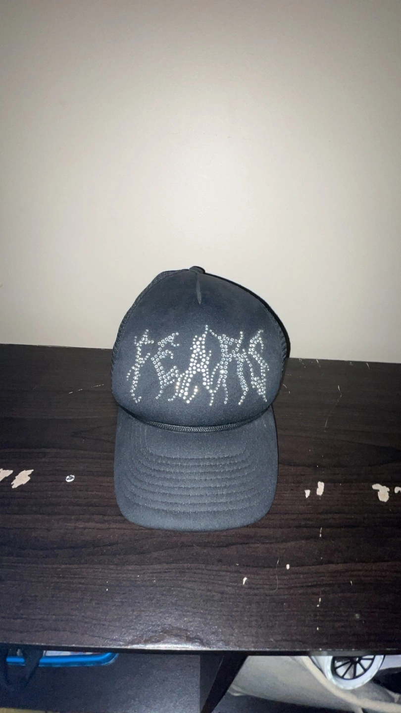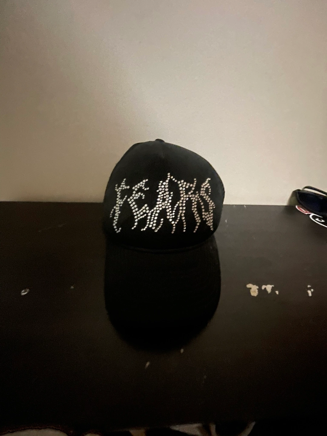 Selling a black trucker hat with 'FEARS' embroidered on the front. It's in great condition and ready for a new home!