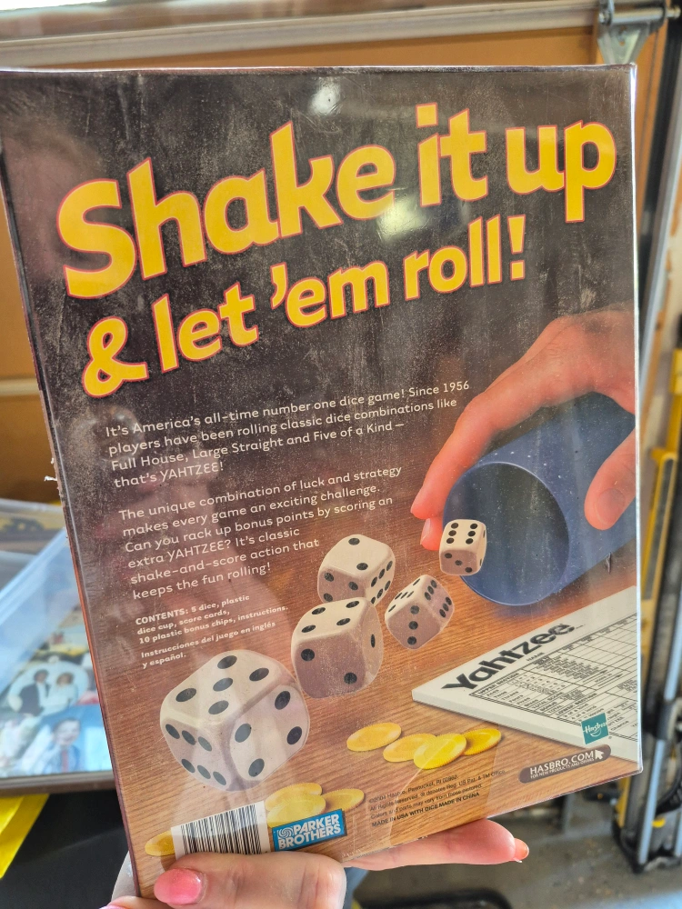 Selling a classic Yahtzee dice game! It's the shake, score, and shout dice game. Ages 8 and up, so it's fun for the whole family. Includes dice, plastic dice shaker, score cards, and instructions