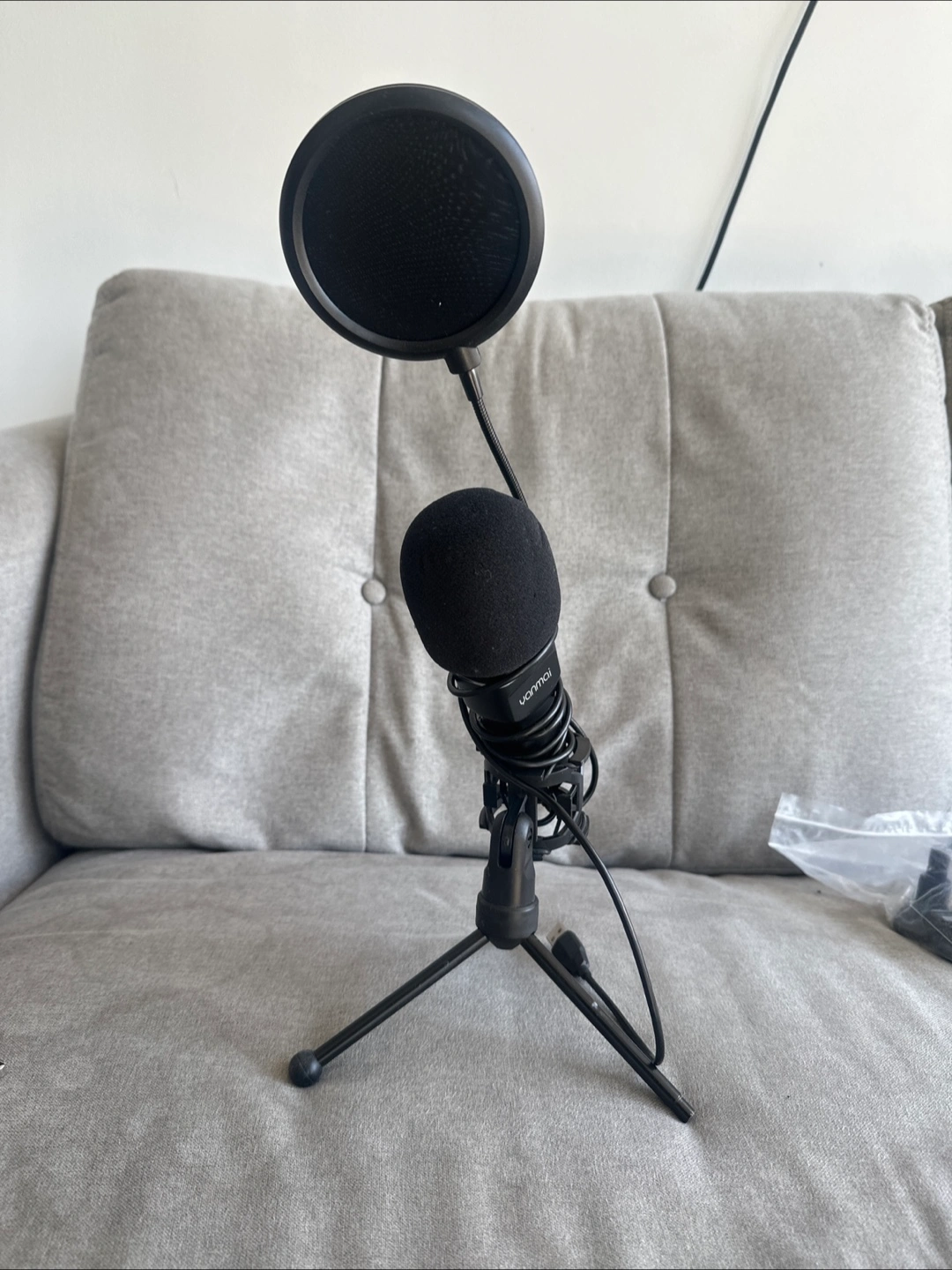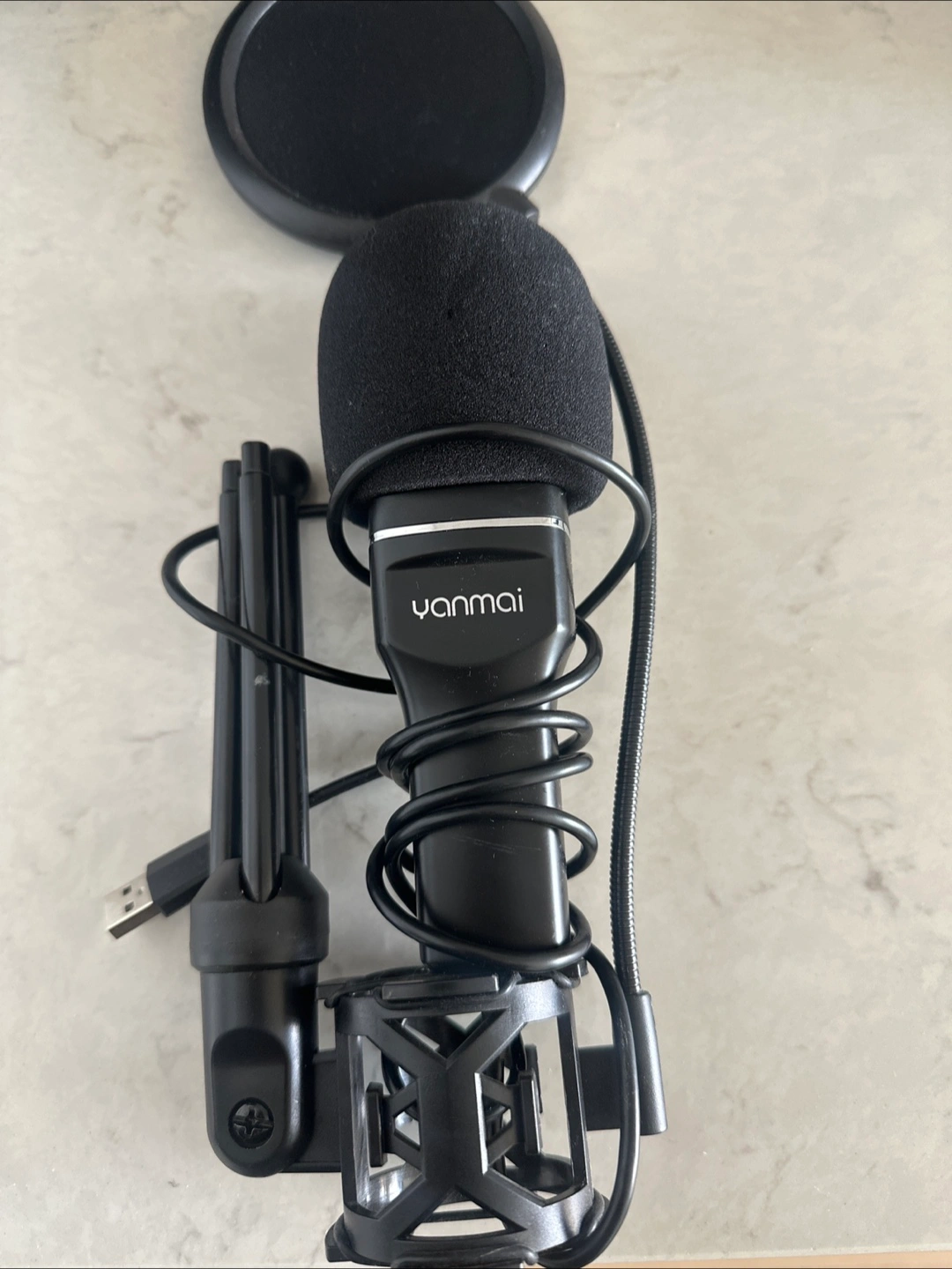 Selling a Yanmai microphone, perfect for recording or streaming! It comes with a handy stand and a pop filter to improve sound quality. It's in great shape and ready for a new home
