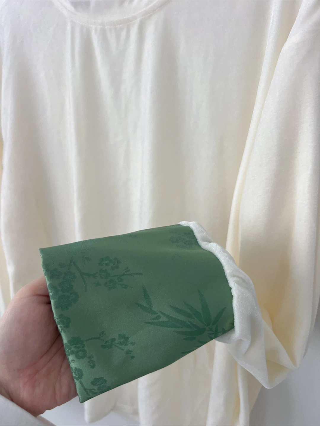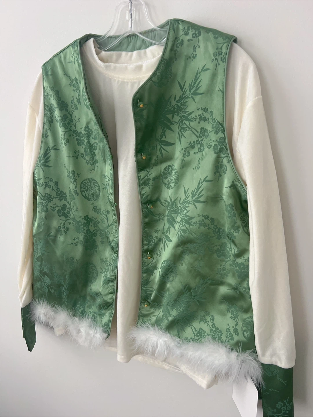 Here's a lovely Yanti set featuring a green floral vest and a cream-coloured top! The vest has a unique design with floral patterns and a soft, fluffy trim. The top is a comfortable cream colour with matching green floral accents on the sleeves. It's a stylish and eye-catching outfit!