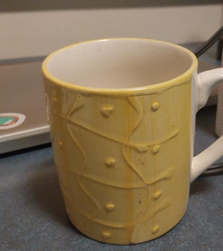 Here's a cute handmade yellow ceramic mug! It has a unique design with raised swirls and dots. Perfect for your morning coffee or tea