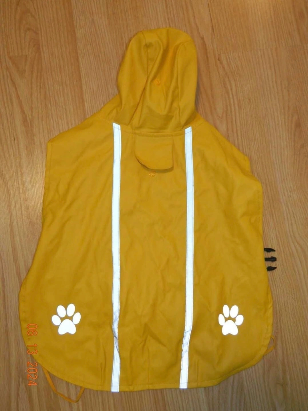 Keep your furry friend dry with this cute yellow dog raincoat! It features a hood and reflective stripes for added safety during walks. The raincoat also has adorable paw prints on the back TOP PAW outdoor dog raincoat...size L(but more like a M)..EUC
