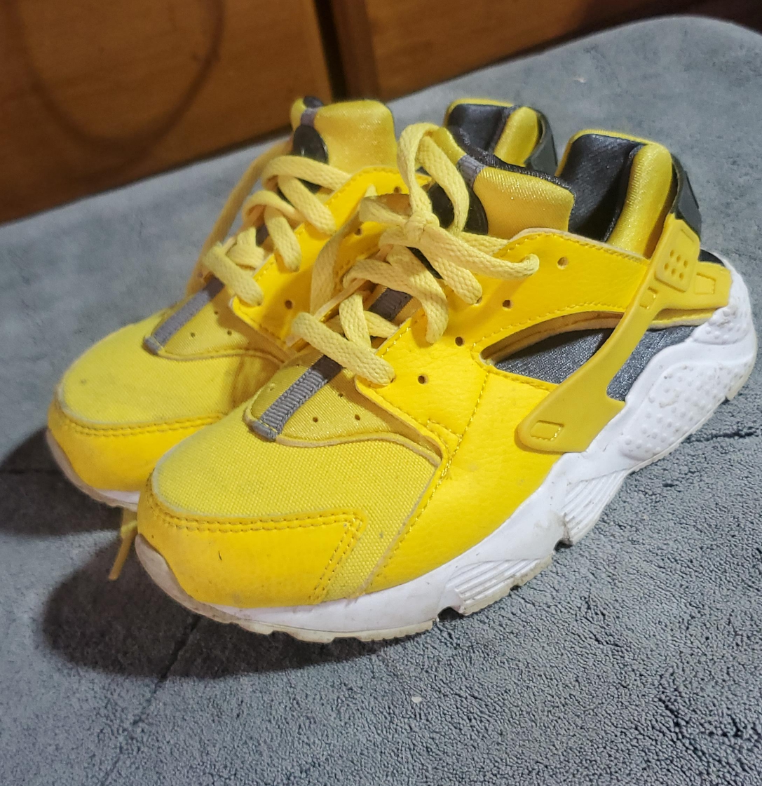 Selling a pair of yellow Nike Huarache kids' shoes. They show some signs of wear, but still have lots of life left!