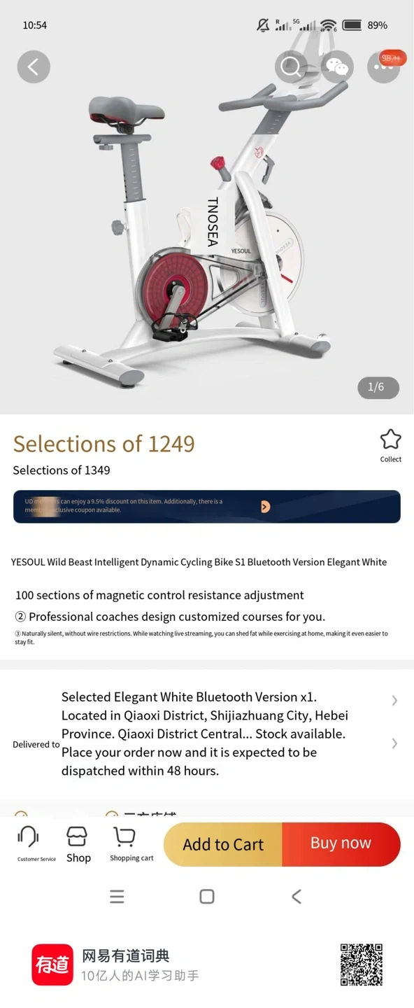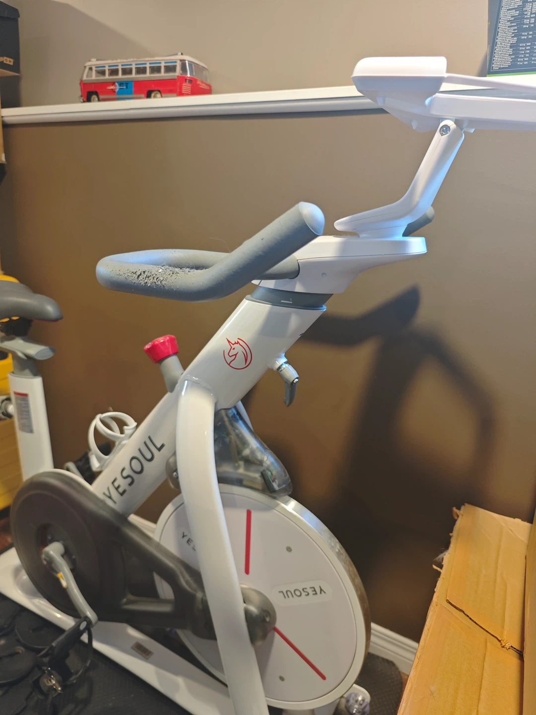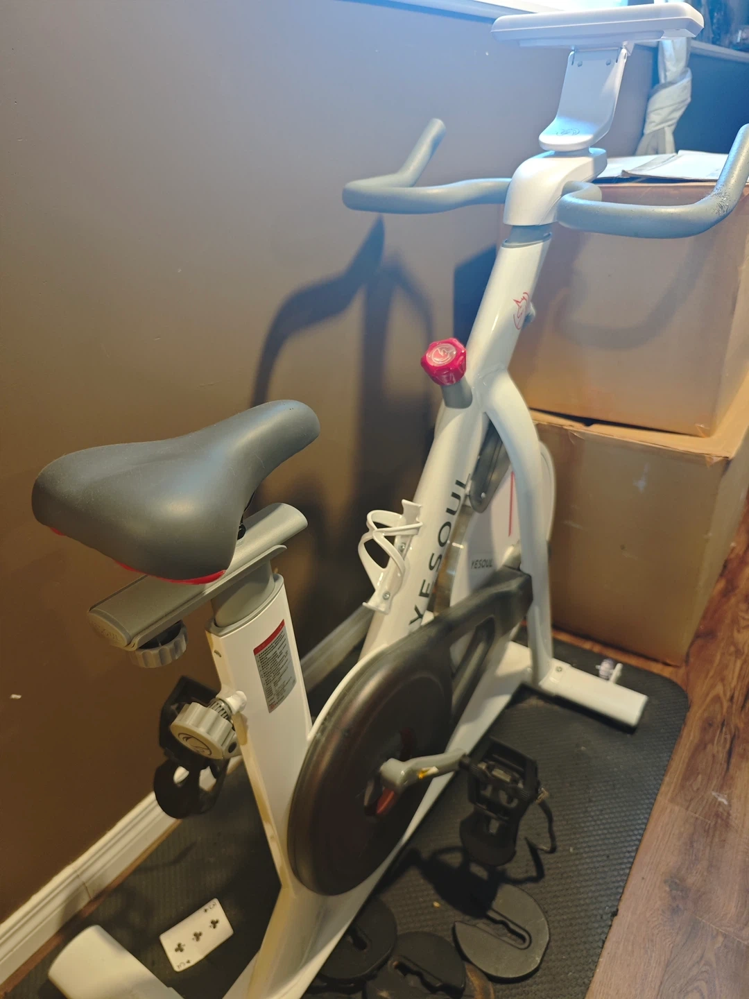 Selling a YESOUL Wild Beast Intelligent Dynamic Cycling Bike S1 Bluetooth Version in Elegant White! This bike features 100 sections of magnetic control resistance adjustment. It also has professional coaches design customized courses for you. It's naturally silent, without wire restrictions, while watching live streaming, you can shed fat while exercising at home, making it even easier to stay fit