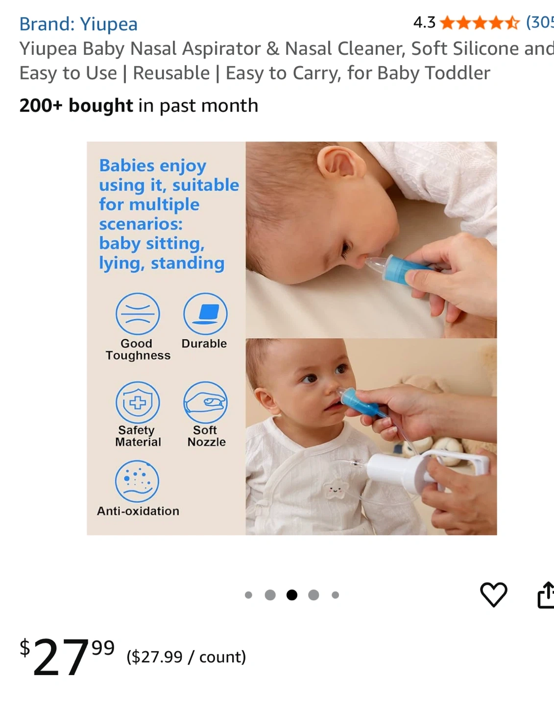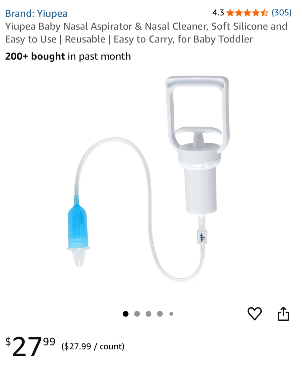Baby nasal aspirator and nasal cleaner. features a soft silicone nozzle and is easy to carry. It is reusable and easy to use for baby and toddler. It also comes with additional accessories: storage bag, storage box, and cleaning brush Gifted to us, already have one.